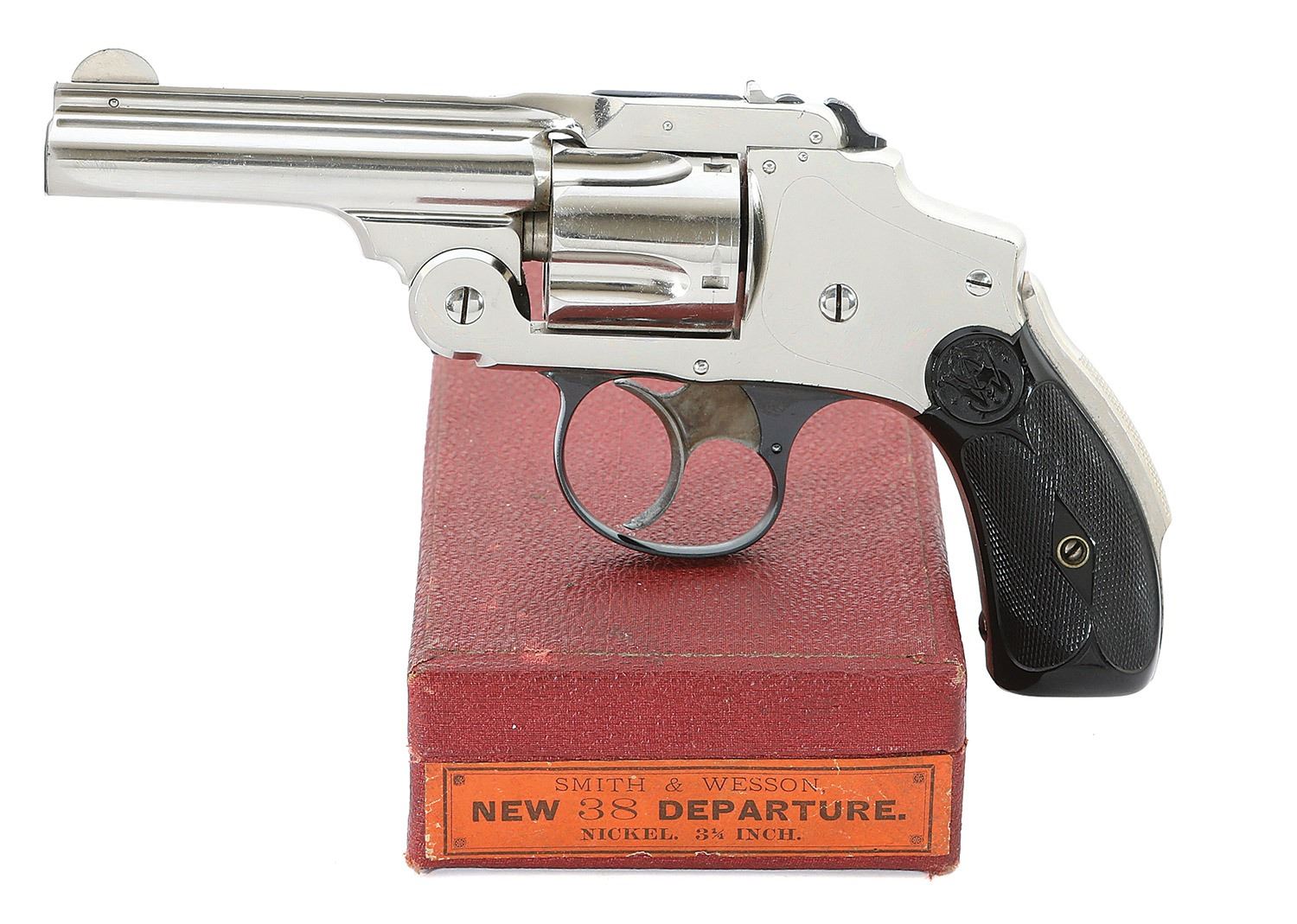 serial #107471, 38 S&W, 3 1/4'' ribbed round barrel with a bright excellent bore. The metal surfaces retain about 98-99% original nickel finish showing a few small flakes to brown along the cylinder and scattered light handling marks. The triggerguard and latch retain a similar amount of original bright blue showing a few errant freckles and the trigger shows somewhat muted but strong case-hardened colors. All markings remain crisp and clear and the black checkered hard rubber grips remain in excellent condition showing a few light handling marks along the edges. Their fit is perfect and the left panel retains a nice patent date along the bottom edge. The serialized parts are matching, barrel-to-frame fit is solid and the action seems to function well mechanically. The included pebbled red paper-covered box remains in very fine to near excellent condition showing some mild edge wear and light handling marks. The correct orange end label is also near excellent and the pencil number on the base is extremely faded and difficult to discern. There are some antique ink markings on the base that are somewhat mysterious ''go ss / gi ss'' and the interior lid label is very fine. A wonderful boxed New Departure revolver. (13B11789-3) {ANTIQUE} (1200/1800)