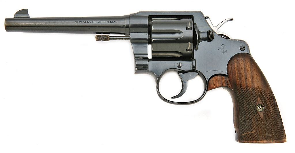 serial #334464, 38 Special, 6" barrel with an excellent bore. This lovely New Service revolver remains in fine condition and is equipped with what is best described as a lightweight skeletonized speed hammer for target shooting. The metal surfaces of this 1932 manufactured revolver retain about 96% original blue showing the heaviest loss to silvering at the muzzle along with high edge wear, a few scattered scratches, and a turn ring on the cylinder. The walnut grips were custom made by an unknown maker. The grips incorporate a filler behind the triggerguard and partial diamond checkering. The completed portions of checkering are fairly well executed but fade to smooth on the upper portions of each panel with uneven and incomplete patterns on both panels. They rate about very good with a 5/8" long deep scratch on the left panel along with scattered light dings and dents. The hammer modification was professionally done with a portion cut away between the arched back and pivot hole, the notch between the hammer face and spur was deepened, then the spur was thinned, reshaped and checkered. The action is very smooth and sure to delight the dedicated wheel-gun shooter. A very nice New Service probably built during the golden age of Bullseye shooting. (A11739-153) {MODERN} (1200/1800)