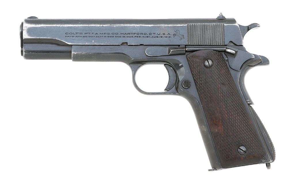 serial #6235, 45 ACP, 5'' barrel with a lightly oxidized and pitted bore showing evident rifling. This pistol shows use over the years and has been arsenal refurbished. The metal surfaces retain about 90% arsenal restored blue, most of the loss to varying degrees of high edge wear, the straps toning to a mix of pewter and brown, handling marks, and some previous pitting under the new finish. The fully checkered walnut factory grips rate fair to good showing moderate to sometimes heavy diamond point wear, and handling marks. This pistol has features found on the vaunted Model 1911A1 such as a half-moon front sight, ''U'' notch rear sight; short, checkered trigger, long grip safety, and it appears to function mechanically. It is correctly serial numbered on the frame under the arched mainspring housing, it bears the model number and Argentine crest on the right side of the slide, and the Colt address on the left side of the slide. The pistol includes a single seven-round Argentine contract magazine that is numbered to another gun. A very good example of the Government Model supplied to fulfill early contract requirements before Argentina started manufacture of the pistol. (8B11739-54) {C&R} (1000/1500)