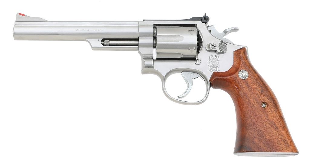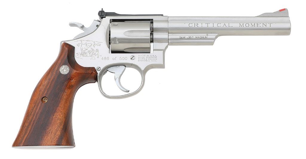 serial #BEW0522, 357 Magnum, 6'' heavy barrel with an excellent bore. In 1990 Smith & Wesson manufactured a series of revolvers for Ellett Bros. of Chapin, South Carolina. There would be 500 manufactured each month themed on different S&W advertisement from years past. The April edition was based on the ''Critical Moment'' advertisement showing a cowpoke trapped under his steed revolver in hand and aimed at a Texas Longhorn steer staring at him menacingly and preparing to continue the attack. The sideplate is laser engraved with this scene and is marked ''486 of 500'' while the right side of the barrel is marked in bold letters ''CRITICAL MOMENT''. The revolver appears as-new-in-box, the stainless steel surfaces rate excellent. This edition was equipped with a .400'' semi-target serrated trigger, .500'' target hammer, and they retain full hard chrome finish. The smooth goncalo alves factory target grips feature silver S&W medallions, are cut for speedloaders, and remain in wonderful condition. This gun features a red ramp front sight, white outline micro adjustable rear sight, and it correctly times and locks up. The revolver includes the factory two piece box that is correctly end labeled and numbered to the gun, cleaning kit, manual, and paperwork. Originally these guns were to be sold by subscription although the full collection of 500 revolvers for each month was never completed due to a parting of business relationship and it is not known exactly how many of each were completed. At 500 guns each month they remain a scarce commodity and desirable collectible. (8B11739-15) {MODERN} (1200/1800)