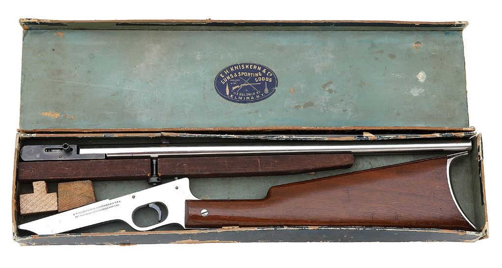 22 RF, 18'' round barrel with a mostly bright very fine bore showing some scattered light frosting and strong rifling throughout. The metal surfaces of this attractive rifle retain about 97% original nickel finish showing a few sparsely scattered tiny flakes, light handling marks and some small areas of subtle clouding. The breechblock retains a similar amount of lovely vibrant case-hardened colors with some sparse freckling and the remaining small parts show remnants of flaking fire blue. The markings along the left side remain crisp and the smooth walnut buttstock remains in about very fine condition showing some scattered light scuffs and minor dings, otherwise retaining about 90% original varnish. The crescent buttplate retains about 97% original nickel finish with some small flakes and minor bubbling. The original sporting sights are intact and the action seems to function well mechanically. The rifle includes a rare original factory box that rates about very fine, the black paper exterior covering showing rather extensive flaking and the two lid end flaps lost to the years. The green label has darkened from the years with details still quite discernible under bright light and the inside of the lid bears a period E.H. Kniskern & Co. retailer sticker from Elmira, NY. The original wooden base spacer is also surprisingly intact. A very fine rifle with extremely rare box for the advanced boys rifle collector. (13B10826-162) {C&R} [Dr. W. Lloyd Hudson, Jr. Collection] (1000/1500)