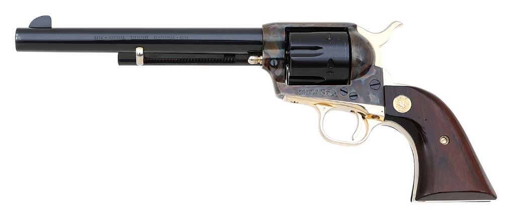 serial #0118MA, 45 Colt, 7 1/2'' barrel with an excellent bore. This fine revolver celebrates Montana's Centennial as a territory and diamond jubilee (75 years) as a state. The metal surfaces of this second generation SAA retain about 98-99% original finishes, the blue on the barrel shows light edge wear while there are very fine lines circumnavigating the cylinder. The frame shows rich swirls of case-hardened colors while the straps, hammer, trigger, base pin, and extractor rod retain 99% plus gold finish. The smooth rosewood factory grips feature gold Rampant Colt medallions and remain in about excellent condition showing a few light handling marks. All the appropriate parts are correctly numbered to the gun. The left side of the barrel celebrates the centennial as a territory while the right side markings celebrate the diamond jubilee as a state. This gun includes a factory presentation case featuring the carved outline of the state, Centennial medallion, and ''COLT'', the interior is French cut with red cloth lining, and a period manual with handwriting on the cover. The exterior of the box rates fair to good with light to moderate scratches and dings scattered about, while the interior rates good plus showing soiling. A nice Commemorative revolver. (8A11755-1) {C&R} (1200/1800)