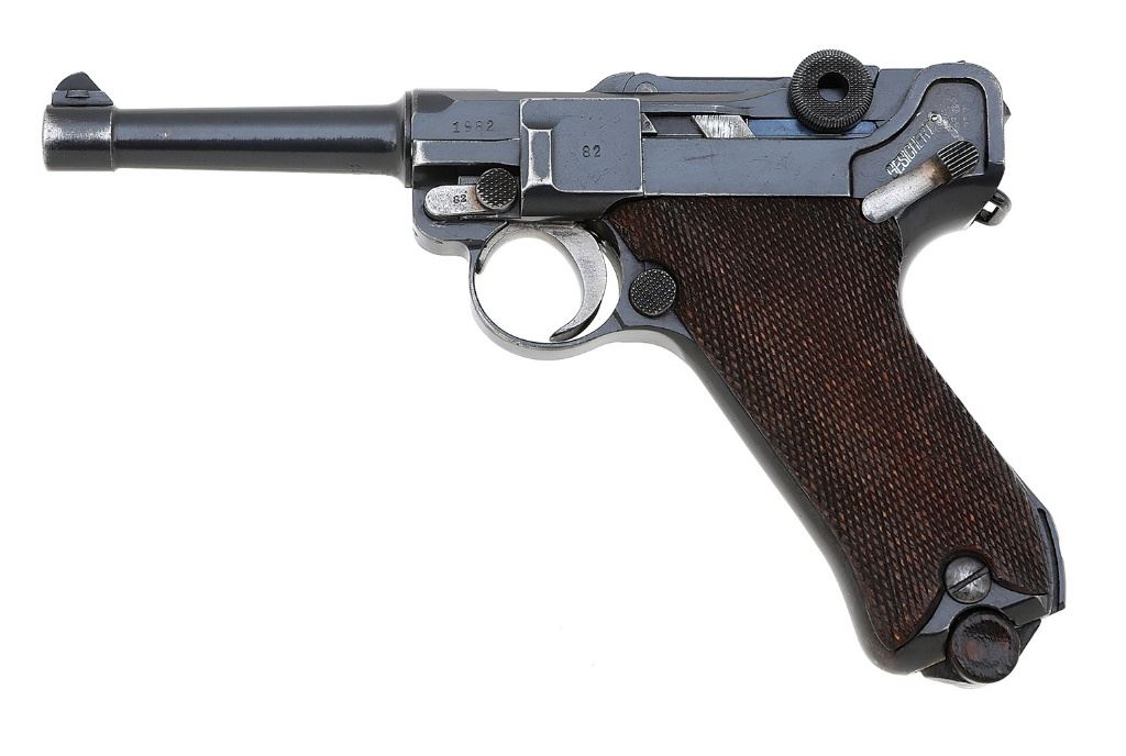 serial #1982b, 9mm, 4'' barrel with a very good bore showing light oxidation in the grooves but strong rifling throughout. The metal surfaces of this 1920-dated military pistol retain about 85-90% arsenal restored blue with light wear on high edges and contact points, the gripstraps toning to a gray-brown patina, and some scattered light handling marks and hints of previous pinprick pitting. The strawed parts have toned largely to a pewter-gray patina with light freckling and remnants of color at the edges, and the sear spring retains vibrant fire blue. The checkered hardwood grips are in very good condition with light chipping and flattening of points, and neither panel are numbered. The metal markings are largely intact and clear with DWM monogram on the toggle, soft Weimar-era dove-style waffenamts, the rear toggle is numbered ''52'', and the remaining numbered parts are matching to the pistol, including the grooved firing pin, and the hold-open is restamped to match. The pistol retains the standard open sights and included is a bright-bodied wood-base magazine showing a crack through the base, renumbered ''1982''. A solid example of these refurbished Luger pistols, issued to the German military and police after WWI. (14A11728-891) {C&R} (1200/1800)