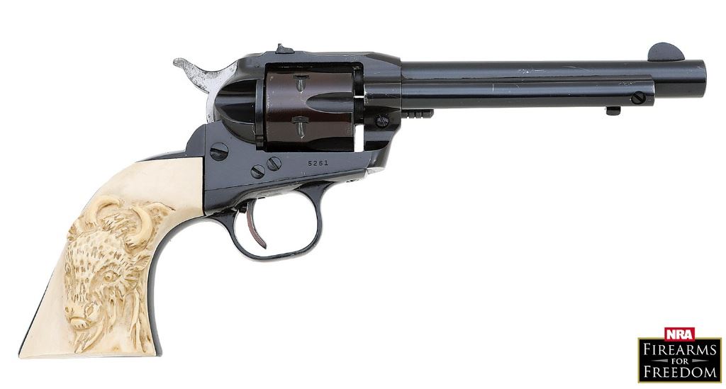 serial #5261, 22 LR, 5 1/2" barrel with a bright excellent bore. This second-year-of-production Type-3 ''flatgate'' revolver retains about 97% original blue with areas toning to a mix of plum and brown under direct light, some mild high edge silvering, a few scattered light nicks and handling marks, and a light abrasion on the backstrap throughout. It retains the standard serrated front sight and drift-adjustable square-notch rear and timing and lockup remain excellent, and the Type 3 serrated ejector rod button; this example has not been equipped with Ruger's transfer bar safety upgrade. It has been equipped with a lovely pair of genuine ivory XR3-pattern grips by an unknown maker, bearing a handsome carving of a bison on the right panel with the left panel remaining smooth, rating excellent overall and showing minimal handling wear throughout with some handsome checking along the bases and the main apology being a chip on the heel of the left panel exposing a hint of the frame. The interior of the right panel is etched ''XR3'' over ''5261'', and overall fit is excellent. A lovely 1950's vintage gun with stylish accoutrement to match. (26A11608-263) {C&R} [N.R.A. Firearms For Freedom] (800/1200)