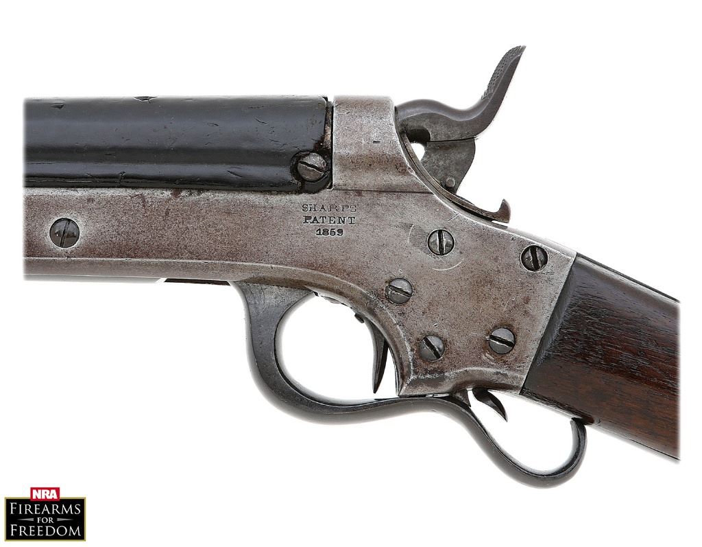 serial #1183, 52 RF, 24'' barrel with a mostly bright about fine bore showing some scattered light pitting in the otherwise strong rifling. The metal surfaces of this second model carbine have aged to a blend of light and dark gray patina with scattered spots of old light oxidation, areas of fine pinprick pitting, and fine cleaning striations on the left side of the frame. The brass buttplate is toning to a warm goldenrod patina with the heel moderately tarnished along with some light impact marks. The black leather barrel covering rates very good plus for its age with a synthetic repair along the seam on the underside, a section is missing from around the front of the frame, and overall moderate crazing. The sliding hammer safety mechanism is mostly intact but no longer blocks the hammer. All the visibly numbered parts are serialized to the frame. The markings are clear with ''SHARPS / PATENT / 1859'' on the left side of the frame and ''SHARPS / & / HANKINS / PHILADA.'' on the right. The walnut buttstock rates very good plus with overall dings and light handling marks; there are no visible cartouches. The locking lever catch and sights are intact, and the action is strong and crisp. A nice example of these interesting Civil War carbines. (23B11608-191) {ANTIQUE} [N.R.A. Firearms For Freedom] (1200/1800)