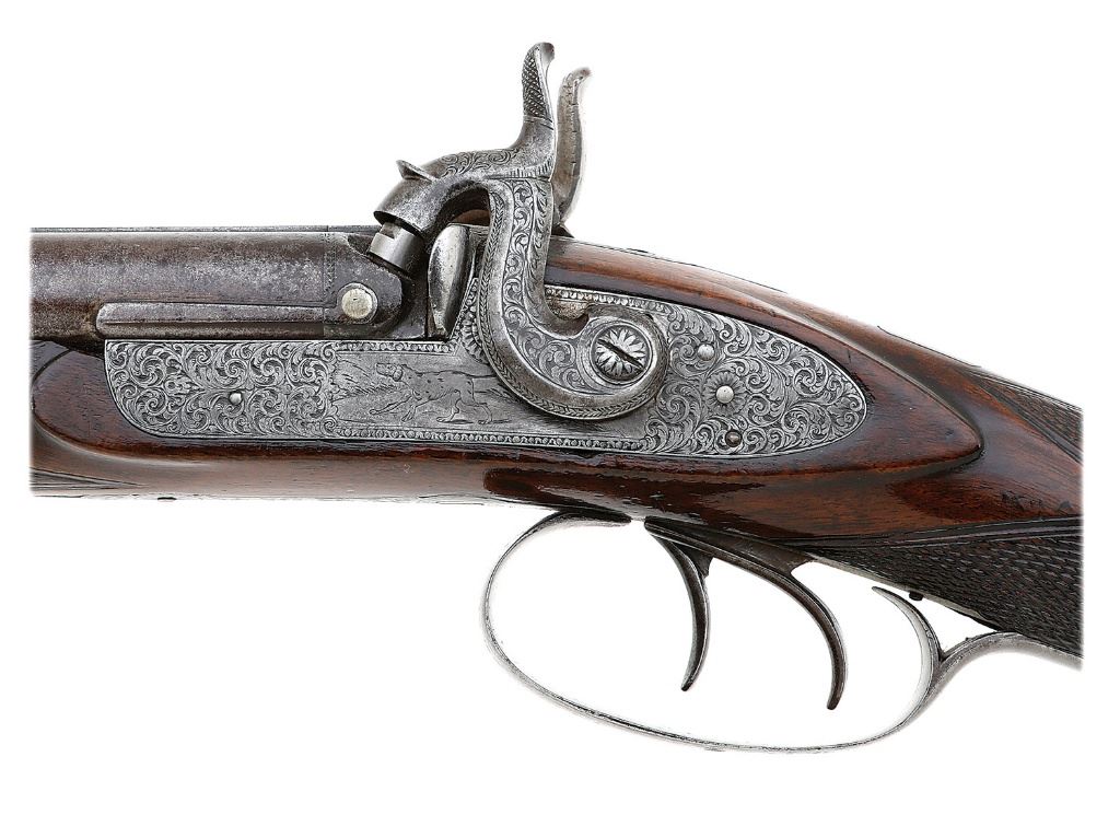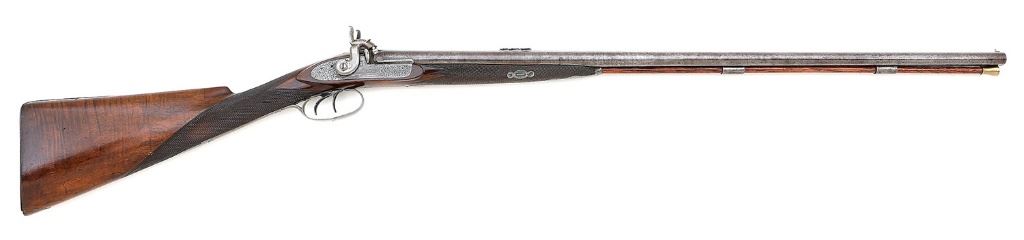 50 bore (.453 cal) & 20 bore, 32'' damascus twist barrels with rifle barrel right and shotgun left, the rifle bore mostly bright and very good showing some scattered light oxidation in the grooves and strong rifling throughout and partially bright about good shotgun bore that shows areas of light pitting and old oxidation. The barrels have mostly toned to a mix of pewter gunmetal and medium gray-brown patina with a bit of sparse light pitting and subtle twist patterns. The undersides of the barrels are numbered ''158'' and are stamped ''T.B.'' along with period London proof and bore marks. The lockplates are mostly a medium gray patina and are embellished with nice quality English scrollwork and endearing game dogs, the triggerguard with a softer scene due to some cleaned light pitting. The nipples are more modern replacements and the right hammer is also a somewhat rudimentary replacement. The checkered walnut stock remains in about very good condition showing some scattered old slivers along some of the edges, light dings, repaired chip at the toe and a well-executed repair at the point of comb. The checkering shows expected honest wear, lockplate fit is quite nice and the sides of the buttstock show some attractive subtle grain figure. There is a small chip at the toe of the smooth steel buttplate and an un-engraved silver monogram plate is present atop the wrist. The locks are functional though the hammers are a bit loose and out of time. A brass-tipped hickory ramrod is present and the gun is sighted with express rear sight featuring three flip-up notches for 100, 200 and 300 yards and the front sight appears to be an old replacement medium post. An interesting old British combination gun. (13B11579-22) {ANTIQUE} (800/1200)