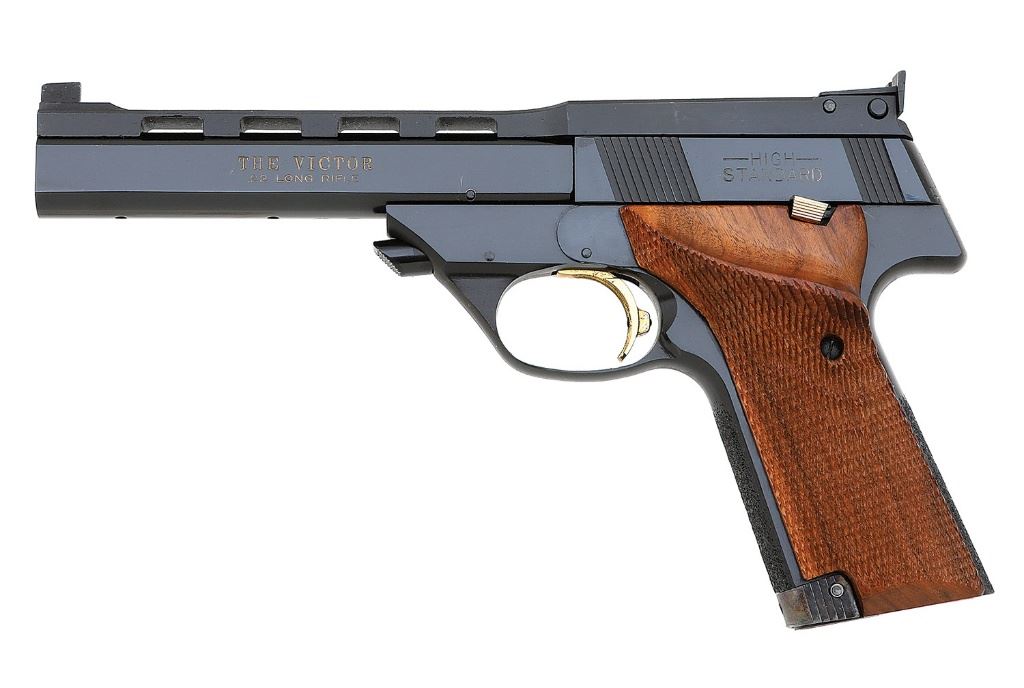 serial #2306710, 22 LR, 5 1/2'' slab-sided barrel with an excellent bore. This 1972 Hamden, Connecticut-manufactured Model 107 remains in excellent condition showing little use. It retains about 99% original blue with a few light handling marks. The trigger and safety retain full gold finish while the magazine catch retains bold case-hardened colors. The checkered walnut factory thumb rest grips rate excellent. This gun features a Patridge front sight, adjustable black blade rear sight, multi groove ventilated steel rib, stippled straps, is factory drilled and tapped for barrel weights (not provided), and the gun is marked ''THE VICTOR'' on the barrel. It includes a factory two-piece black box with Styrofoam insert and a factory marked ten-round magazine with plastic floorplate extension. A beautiful example. (8A11493-123) {C&R} (800/1200)
