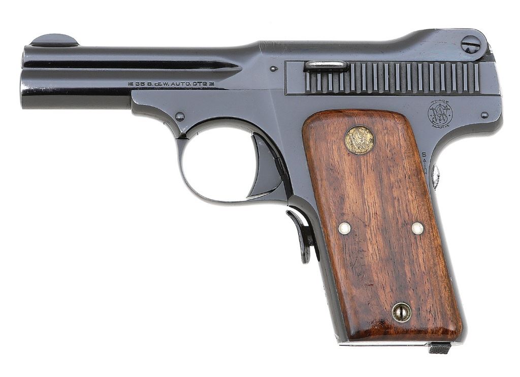 serial #864, 35 S&W, 3 1/2'' barrel with an excellent bore. This lovely Second Model 1913 remains in wonderful condition and retains about 98% original blue showing light edge wear, scattered flecks of brown, and the top of the rear sight has toned to plum. The smooth walnut factory grips feature gold S&W medallions, are numbered to the gun, and remain in excellent condition. This gun features fixed sights, rocker safety on the backstrap, and plunger-style safety on the frontstrap although this safety only needs to be pushed straight back to fire. It includes a single factory seven-round magazine. A fine example of the ''Model 35'' pistol. (8A10826-540) {C&R} [Dr. W. Lloyd Hudson, Jr. Collection] (800/1200)