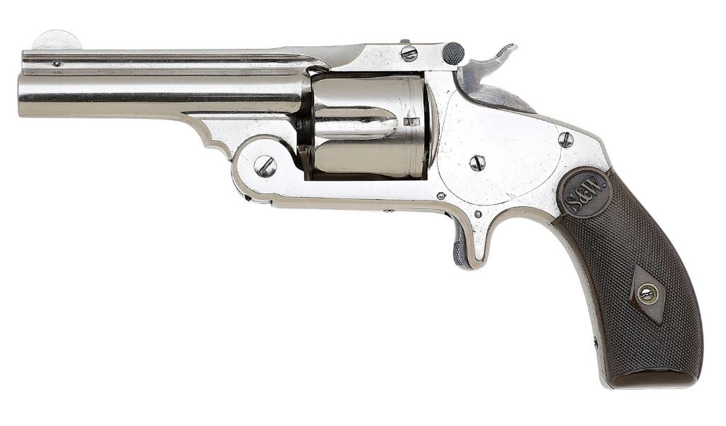 serial #539, 38 S&W, 3 1/4'' barrel with a lightly oxidized and pitted bore showing strong rifling throughout. This lovely gun shows light use and retains about 99% original nickel finish showing scattered light freckling, handling marks, and few very light dings. The hammer retains strong case-hardened colors showing moderate operational marks while the trigger retains strong blue showing slight wear. The un-numbered diamond checkered hard rubber factory grips feature S&W monograms, have toned to brown, and remain in excellent condition. The barrel and top latch are numbered to the gun while the cylinder is numbered to another gun, barrel to frame fit is tight, it has a pinned half-moon front sight, and fixed rear sight. A very nice Second Model. (8A10826-506) {ANTIQUE} [Dr. W. Lloyd Hudson, Jr. Collection] (800/1200)