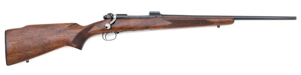 serial #448809, 270 Win, 22'' barrel with a bright very good bore with scattered light pitting but strong rifling throughout. The metal surfaces of this 1959-made rifle retain about 90% original blue with light wear on the high edges and contact points, mild thinning on the receiver, some light handling marks, and the magazine floorplate has toned to a silvery patina. The bolt remains bright with light operational wear and some scattered gray freckling. The checkered pistolgrip walnut stock is in very good plus condition with a few light dings and handling marks and light wear to the checkering, the checkered hard rubber buttplate intact and showing general light wear; the stock shows the beginnings of some nice grain figure around the floorplate. The factory markings are intact and crisp, and the bolt is unnumbered; the rear action screw shows slot wear. The rifle has no provisions for open sights but is factory drilled and tapped for optics mounting, the forward Redfield base still mounted to the receiver as one screw is stripped and will require attention to remove. Included is a Redfield 2-7x40mm with clear glass and a duplex reticle, showing a few light handling marks, and the remaining Redfield base and Leupold rings. A solid Winchester rifle that should still perform well. (14A11692-3) {C&R} (800/1200)