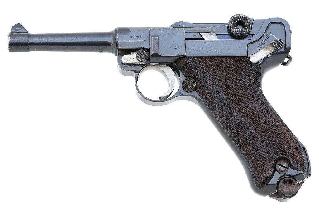 serial #5541f, 9mm, 4” barrel with a good bore with light pitting but evident rifling throughout. The metal surfaces of this 1915-dated pistol retain about 85% original blue with light wear on the high edges and contact points, wear on the gripstraps toning to brown, moderate thinning on the receiver, and some light handling marks. The strawed parts retain very good coloring mellowing lightly to a silvery patina, save the trigger which has worn near completely to a silvery patina with a fine freckling, and the toggle pins and sear spring show vibrant fire blue with light wear on the pins. The checkered walnut grips are in very good condition with general light wear and softening of the checkering, and both panels are numbered to the pistol. The metal markings are intact and clear with the DWM monogram on the toggle and Imperial German proofs on the receiver, the eagle firing proof on the barrel only partially visible, and all the numbered parts are matching to the pistol, save for the grooved firing pin which is numbered “34”; the rear toggle pin is unnumbered. The pistol retains the standard open sights. Included is a bright-bodied wood-base magazine in very good condition with spots of pinprick and light pitting, and the base is faintly numbered “6179u” above “+”. An attractive WWI-vintage P.08 Luger pistol. (14A11810-4) {C&R} (800/1200)