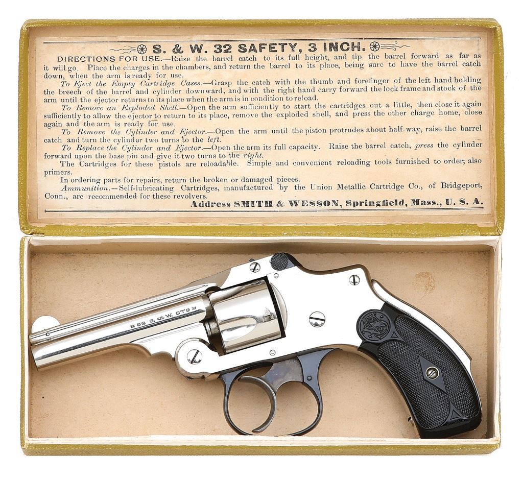 serial #160927, 32 S&W, 3'' barrel with a bright very good bore showing a few scattered areas of pinprick pitting with strong rifling throughout. This handsome Second Model revolver retains 99% original nickel finish, showing only very light handling wear with a few flecks of scattered oxidation staining. The triggerguard and rear sight latch retain generous original blue showing minimal oxidation staining under direct light and the trigger has toned to a handsome gunmetal patina and shows handsome case-hardened colors. The checkered hard rubber grips rate excellent, remaining a deep handsome black and showing little if any handling wear. Timing and lockup appear sound and ejector function remains robust. Included is the original hinged green box, internally and end-labeled to the gun, which remains in remarkable condition for its age, rating excellent and showing only a few negligible spots of edge wear and soiling. Examples in this condition are seldom-encountered, doubly so with the original box, making this an exciting opportunity for the collector. (26A10826-289) {C&R} [Dr. W. Lloyd Hudson Jr. Collection] (800/1200)