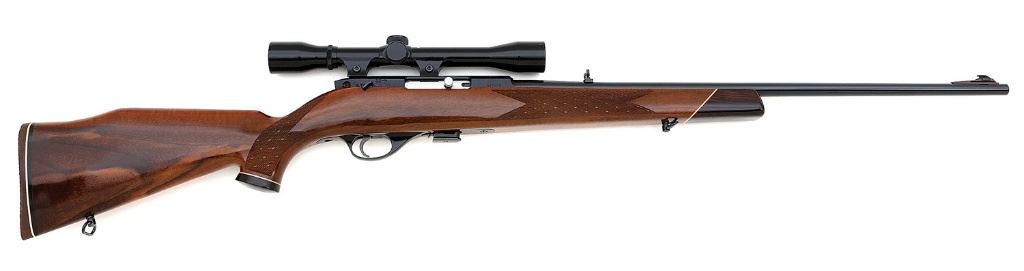 serial #N61456, 22 LR, 24'' barrel with an excellent bore. The metal surfaces retain about 99% original blue with a few light handling marks and some areas toning lightly to brown. The bolt remains bright with a section of jeweling. The checkered walnut Monte Carlo stock rates excellent with a few light handling marks. The stock features include skip-line checkering, a rosewood forend tip and gripcap with diamond inlay, swivels and a slim brown rubber rifle pad. The original sights remain intact, minus the front sight hood and the receiver is groove for mounts. Mounted to the receiver is a Weatherby Mark XXII 4x50 riflescope. The scope features a duplex reticle and has bright, clear optics. Included is a single detachable magazine and a Kassnar sporting leather sling. Please note the additional magazines available in the timed sale. An excellent example overall of these classic rimfire sporting rifles. (4A11690-14) {MODERN} (800/1200)
