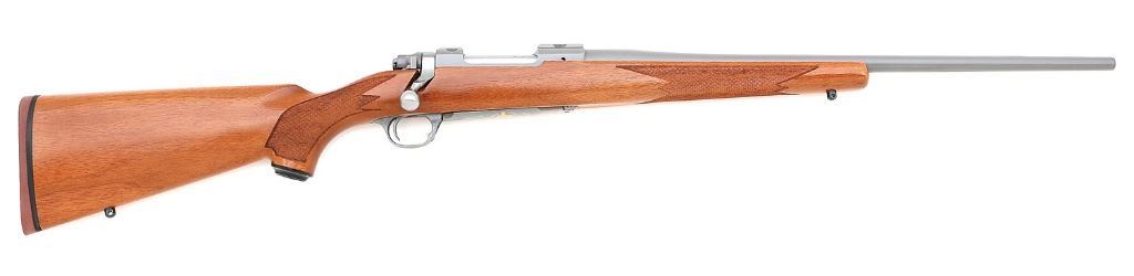 serial #NHFG-0137, 308 Win, 22'' barrel with a bright, excellent bore. The bead blasted stainless steel surfaces rate excellent with perhaps only a few light handling marks from storage. The floorplate is factory engraved with foliate patterns that border the 14 karat gold NH Fish & Game 150th Anniversary logo in center and is numbered ''137 of 150''. The checkered American walnut stock rates excellent and is very blonde in color, a nice change from the more ruddy browns typically seen in the M77 series rifles. The receiver is grooved for mounts and there are no provisions for open sights. The original box is included and contains the manual, lock, a set of factory 1'' scope rings, and a certificate of authenticity. Only 150 of these special edition rifles were made to celebrate the NH Fish & Games 150th anniversary in 2015. They were sold exclusively through LL Cote, an Errol, NH based north country dealer located in in the White Mountains area of the state. This is an awesome opportunity for any Ruger or NH wildlife enthusiast to own such a limited issue rifle that is in as-new-in-box condition. (4B11599-1) {MODERN} (800/1200)