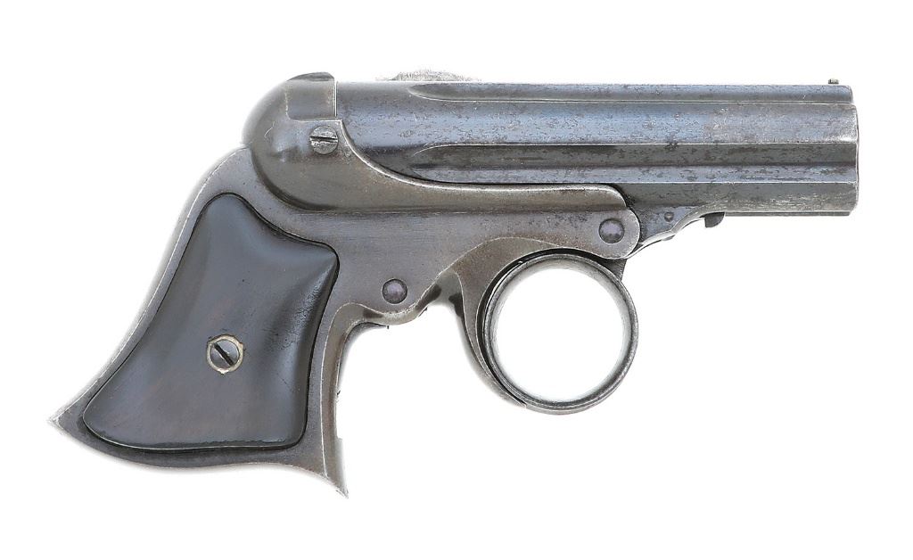 serial #2873, 22 RF, 3'' five-barrel cluster with partially bright about good bores showing some patches of moderate oxidation and strong rifling. The barrels of this attractive example retain about 70% original bright blue showing some light oxidation speckling and flaking to mild gray-brown patina. The barrel address and patent markings remain crisp and the frame shows good flakes of original bright blue in the protected areas, mostly flaked and toned to a nice deep smooth gray-brown patina. The ring trigger shows remnants of smoky case-hardening while the trigger bar retains nice fire blue. The smooth rosewood grips rate near excellent with a few scattered light handling marks, the silver bead front sight is intact and the action seems to function well mechanically. A fine example of these popular pocket pistols. (13A11777-27) {ANTIQUE} (800/1200)