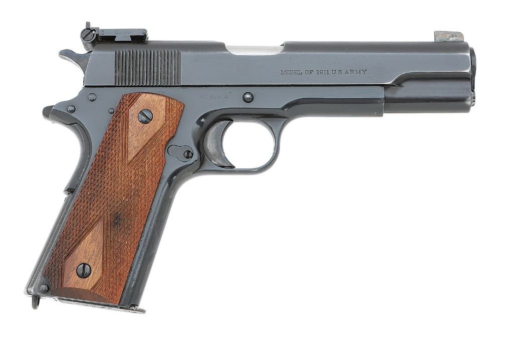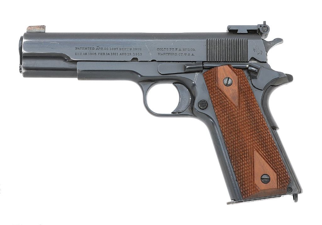 serial #32864, 45 ACP, 5'' replacement Flannery barrel with an excellent bore. This 1913-manufactured pistol has been non-factory refinished and several parts replaced. The metal surfaces retain about 97% restored blue with high edge wear, scattered handling marks and old pitting under the new finish. The grips are contemporary replacement double diamond checkered walnut stocks that remain in excellent condition and follow the Remington UMC checkering pattern. This gun features a Patridge front sight, early-style Elliason adjustable rear sight, the thumb safety, hammer, and slide stop are 1911A1-style replacements, the remaining controls appear correct for the period of manufacture, and the pistol appears to function mechanically. The markings on the slide remain strong while all the factory and ordnance markings on the frame have been removed during the refinish, and the serial number is soft but legible. The pistol includes a single contemporary commercial Colt marked seven-round magazine. This pistol is configured similarly to a Bullseye match pistol of post-WWII. (8B11303-7) {C&R} (800/1200)