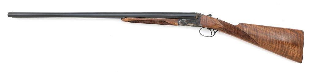 serial #G00288A, 12 ga., 28'' barrels choked modified and improved modified with bright excellent bores. The barrels, triggerguard and top lever retain 99% original blue with a few tiny dings on the right edge of the barrel rib only worth mentioning due to the like-new condition of this lovely shotgun. The frame retains all its case-hardened colors and features the Webley & Scott name in gold on both sides and tight laser-engraved foliate scroll throughout. The checkered walnut splinter forend rates as-new while the English-style buttstock rates excellent plus with a fine scratch on the right side of the comb. The elegant walnut buttplate with Webley & Scott ''winged clay'' logo provides a 14 5/8'' length of pull to the single selective trigger with drops of 1 9/16'' and 2 5/8''. The ejectors are robust, the barrel is sighted with a silver bead and the action appears to function well mechanically. This fine shotgun is consecutively-numbered with the previous lot. (23B11739-4) {MODERN} (800/1200)