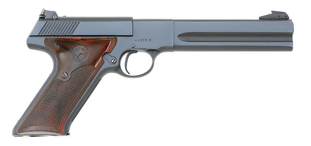 serial #44152-S, 22 LR, 6'' full lug heavy barrel with an excellent bore. This lovely 1950-manufactured Second Series Match Target has been refurbished and remains in excellent condition. The pistol retains about 99% factory quality restored blue with some minor handling marks and shows old pitting under the new finish on the right side matte barrel flute. The factory checkered Coltwood thumb rest grips rate excellent and feature a Rampant Colt monogram on the right panel. This gun features an undercut Patridge front sight, Coltmaster adjustable rear sight, serrated front and backstraps, and appears to function mechanically. This pistol includes a factory hinged leatherette box that is correctly end labeled to the pistol although the penciled serial number is no longer visible, ten-round Colt marked magazine, test target numbered to the gun, and quad-fold manual. The box rates about good to very good with light edge wear, one corner is torn, light peeling of the leatherette covering on the hinge, and slight peeling of the label with a corner missing. The manual is totally oil stained but still quite legible while the target rates good showing light scattered oil staining and tears developing in the folds. An excellent pistol for the upstart collector or enthusiast. (8A11739-19) {C&R} (800/1200)
