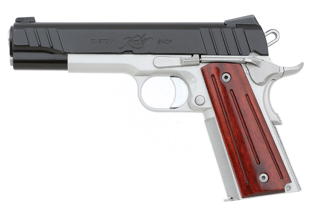 serial #KF26361, 9mm, 5'' barrel with an excellent bore. This lightweight Government Model style pistol has seen minimal use and remains in excellent condition. The pistol retains about 99% original black finish on the slide and silver anodized ''KimPro II'' finish on the frame. The smooth rosewood factory grips feature three vertical grooves and remain in excellent condition. This gun features three dot Novaks style night sights that still glow, bold front and rear slide serrations, checkered frontstrap, checkered flat mainspring housing, long trigger with overtravel stop, and beavertail grip safety with memory bump. It includes a single factory nine-round magazine. A nice lightweight carry gun for those that prefer a full size gun. (8A11739-64) {MODERN} (800/1200)