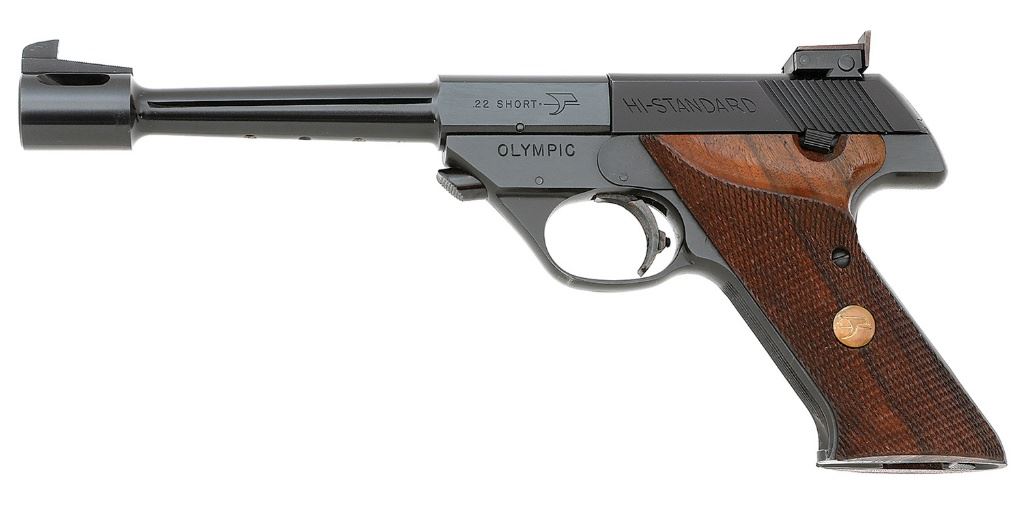 serial #2122090, 22 Short, 6 3/4'' tapered barrel with a bright excellent bore. This Model 104 Olympic shows minimal use and remains in wonderful condition. The metal surfaces retain about 99% original blue and anodized finishes with a few minor handling marks. The trigger and magazine catch retain full case-hardened colors while the safety has full blue. The checkered walnut factory thumb rest grips feature gold High Standard medallions and rate excellent. This gun features Patridge front sight, black blade adjustable rear sight, the barrel is grooved for barrel weights, and integral muzzle stabilizer. It includes a single factory ten-round magazine. An excellent example. (8A11739-84) {C&R} (800/1200)