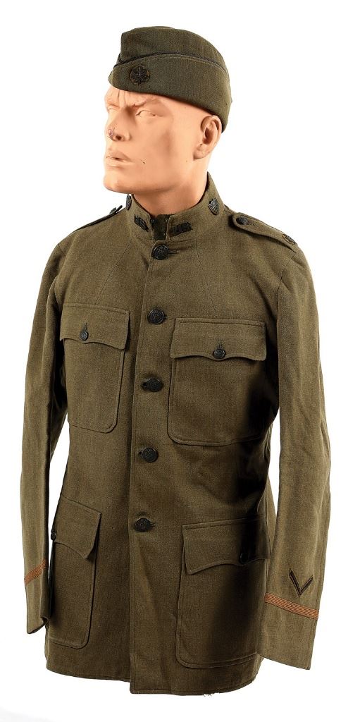 This grouping consists of Moriarty's tunic, sidecap, Sam Browne belt, footlocker, framed photo of Moriarty, photocopy of Moriarty's home, officer's record book, cardboard gift box, and Riker case containing an assortment of uniform insignia and military paraphernalia. The tunic retains a black velvet manufacture tag on the interior that displays ''MAR (in wreath) / MICHAEL A. RIENZI & CO. / INCORPORATED / PHILADELPHIA'' with the inside left pocket retaining a white name tag marked ''Mr. Capt. A. I. Moriarity / Date 8-24-17 / No. 491''. The insignia comprises brass ''U.S.'' collar pins, Adjutant Corps shield pins, tarnished gold bullion epaulet Major rank, and a single War Service chevron on the left sleeve. The tunic remains in excellent condition with a few snags in the fabric, wear on the high traffic areas and along the hem, loose threading, and minor staining from long term storage. The wool sidecap remains in very good plus condition with two small moth holes along the left side and minor handling wear on the interior liner and sweatband. The sidecap features dark blue-gray piping with lightly tarnished sewn gold bullion major insignia on the left front. The brown leather Sam Browne belt, cross strap, and brass hardware all remain in excellent condition with mild verdigris on the metal surfaces, minor cracking and creases, and overall light handling wear. The included footlocker trunk measures 31''x17''x13 1/2'' with the top of the lid displaying Moriarity's name and service number. The footlocker remains in very good plus condition with general handling wear and Moriarty's name on the lid. A framed photo of Moriarty as a Captain in WWI is included along with a photocopy of his home in New Jersey with some notes on his background are included. A blank ''OFFICER'S RECORD BOOK'' and cardboard gift box addressed to Moriarty are present with a Riker case containing two Major insignia, Moriarty's bracelet, Moriarty's ID discs, three Victory Medal ribbon bars, Advanced Section Services patch, eight additional brass Federal Eagle uniform buttons, American Legion lapel pin, extra brass ''U.S.'' collar pin, disc necklace named to Moriarty, brass ''312'' artillery brass hat pin. The assorted accouterments and additional paperwork remain in excellent condition with mild handling marks and long term storage wear. A distinguished U.S. Army officer who went on to have a full life after the war. (28C11738-PV19) [John A. Micavich Collection] (800/1200)