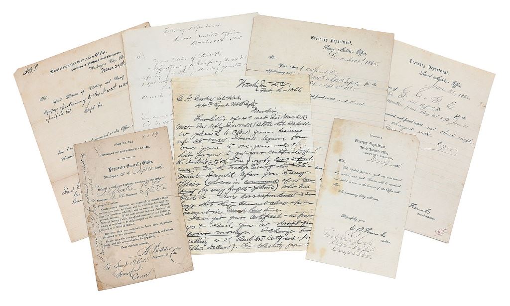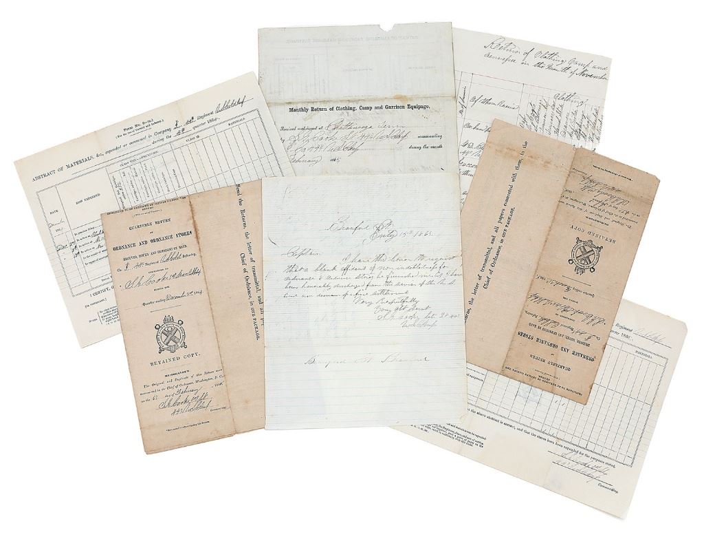 This grouping consists of a binder containing about 45 pieces of ephemera relating to 1st Lt. Samuel G. Cooke's Civil War career. There are two letters that are of particular interest, one which he sent to Atlanta, Georgia to arrest deserters, and the second, after Cooke was taken as a prisoner of war, signing a letter stating he ''will not bear arms against the Confederacy…'' Other letters detail his medical fitness and resignation from the 44th with several documents signed by Cooke relating to ordnance and stores, and expenditures for clothing and other materials. Research is provided for other individuals mentioned in Cooke's letters as well as background information on his unit and the battles they were in. Additional post Civil War letters and documents are included such as a Civil War veteran reunion pamphlet and a reception flyer from Connecticut. 1st Lt. Cooke resided in Greensburg, MO and enlisted on 10/14/1861 as a Corporal with A Company IL 50th Infantry then was promoted into A Company of the U.S. CT 44th Infantry on 9/9/1864. An incredibly rare ensemble from one of the first racially integrated military units. (28B11738-PV35) [John A. Micavich Collection] (800/1200)