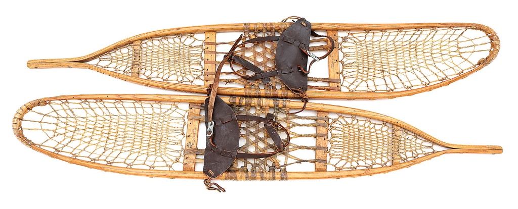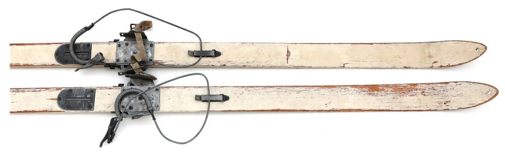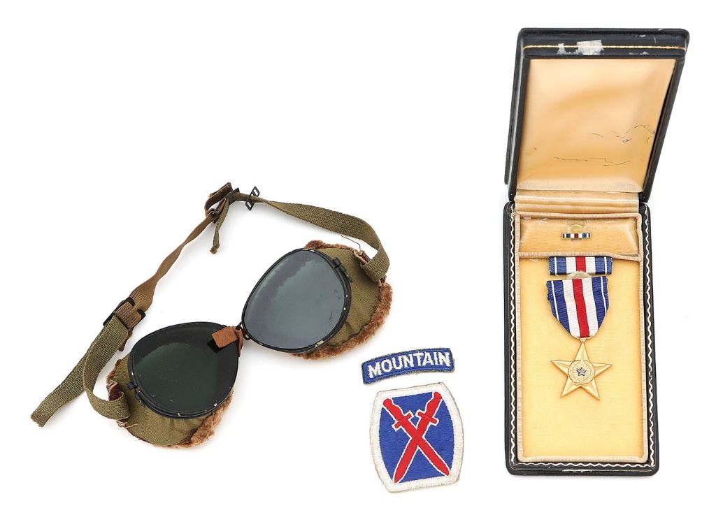 This grouping consists of an inscribed “Preston T. Coursen” Silver Star Medal with presentation case, WWII 10th Mountain Division skis, poles, snowshoes, goggles, unit patch, “MOUNTAIN” tab, a binder containing four carbon copy correspondence letters on his Silver Star award, five personal photos of Coursen while in Italy, and information on the 10th Mountain Division’s accolades during the war. The Silver Star Medal, lapel pin, and presentation case all remain in excellent condition with its only apologies being a few stray ink stains scattered throughout the satin top cover of the case. The skis and poles remain in very good plus condition with fine flaking and cracking, light edge wear, mild tarnish on the metal surfaces, and one suede foot binding no longer present on the skis. The skis are both marked “Dovre / 1943” on the metal brackets with the poles marked “NORTHLAND – U.S.” along the bottom metal shaft. The Alaskan-style snowshoes retain a thick lacquer finish throughout with the webbing and frame remaining in excellent condition and the brown leather foot bindings exhibiting fine flaking and minor creases. The snowshoes are marked “10x58 / 11084 / 1943” on the heel with the toe bar marked “U.S. / C.A. LUND / HASTINGS, MINN” and one of the snowshoes exhibiting “U.S.A. / B.Q.M.D. / 10” ink stamp above the manufacturer marking. The googles remain in very good plus condition with the center leather seam broken and all other hardware present including strap, buckles, and fur insulation around the eyes. The included insignia remains in excellent condition with the included binder adding to the provenance of each piece described in this grouping. (28B11738-PV29) [John A. Micavich Collection] (800/1200)