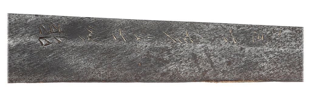 This Army Officer's sword is generally referred to as the "1944 Pattern" and has been attributed to Japanese Marines, or other organizations, but they are simply late war Army Officer swords produced out of necessity due to material shortages. These swords were simplified versions of the 1930s version of the Shin-gunto and were apparently meant to use less materials to produce an acceptable Army Officer sword so late in the war. The sword measures 37 1/8'' overall with a 26 1/8'' curved single-edged blade in traditional shinogi-zukuri form with a thick spine, plain brass collar, straight-backed wedge point and tempered cutting edge with a straight temper line. The hilt is mounted in blackened iron with a plain disc tsuba, rounded pommel and sakura-shaped menuki. The grip is covered in white shagreen and bound in brown twisted cotton cord. The blade remains in near excellent condition with light scratches, a couple spots of freckling and minor nicks along the main edge. The tang shows areas of cloudy dark patina and is signed on the obverse face with the manufacture date on the reverse side. The hilt is in fine condition with light finish wear along the edges of some of the metal surfaces, the cord shows hints of light soiling and wear along the retention pin holes. The scabbard is caramel-painted steel with copper-toned steel mounts. The scabbard remains in excellent condition with no dents, some light age staining and a spot or two of light oxidation. A fine example of Japanese craftsmanship from the final days of the war making an interesting variation for the collector. (5C11738-SW9) [John A. Micavich Collection] (800/1200)