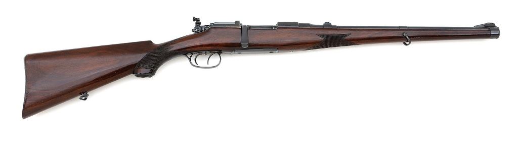 serial #20395, 6.5x54mm MS, 17 1/2'' barrel with a bright excellent bore. The metal surfaces retain about 90% original blue showing some scattered mild freckling and areas toning slightly to a pleasant gray-brown patina under bright light. The bolt clip retains good straw color while the bolt release shows flashes of thinning fire blue and the trigger plate retains smoky case-hardened colors. All markings are crisp and clear and the checkered capped pistolgrip walnut stock remains in very good plus to very fine condition showing just some scattered light dings and handling marks from honest use, the checkering remaining strong and stock fit nice throughout. Stock features horn pistolgrip cap, left-side cheekpiece, sling swivels and grooved steel buttplate with cartridge trap. The rear sight dovetail has been blanked and the rifle is sighted with a Lyman bolt cocking piece-mounted peep sight and German silver bead front on matted ramp. The bolt is matching the receiver and the action with double set triggers seems to function well mechanically. A fine honest Mannlicher Schoenauer. (13A11768-22) {C&R} [N.R.A. Firearms For Freedom] (800/1200)