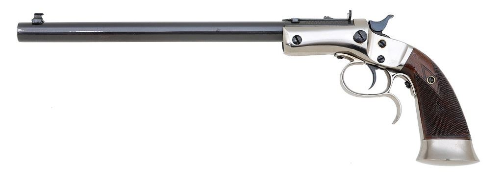 serial #20714, 22 RF, 10'' part round part octagon barrel with an overall bright excellent bore showing a narrow ring of lightly oxidized pinprick pitting just forward of the barrel leade. This excellent pistol retains about 97% original blue and nickel plate, most of the loss to high edge wear at the muzzle and handling marks, the blue appears strong in ambient light but tones to purple under strong light. The diamond checkered walnut factory grips are numbered to the gun and remain in excellent condition. This gun features an iron frame, bead front sight, step adjustable sporting rear sight, tight barrel to frame fit, and crisp action. All the appropriate parts are correctly numbered to the gun. An excellent example of the Conlin. (8A10826-738) {C&R} [Dr. W. Lloyd Hudson, Jr. Collection] (800/1200)