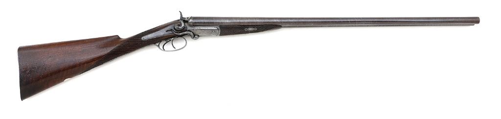 serial #11903, 12 ga (2 1/2), 30'' damascus barrels, unchoked, with bright very fine bores that have been lightly honed and show a few tiny raised dings here and there. This interesting double was made by W.W. Greener who reportedly used his ''W. Wellington'' name on early guns intended for export and are some of the few sidelever models made by Greener. The barrels retain about 85% original plum-brown finish showing some scattered light handling marks and a bit of thinning to mild gunmetal gray patina along the sides, otherwise retaining lovely damascus patterns throughout. The barrel rib retains crisp markings ''W. WELLINGTON. 61 LOVEDAY St BIRMINGHAM.'' The action and back action lockplates retain perhaps 65% nice vibrant original case-hardened colors, particularly bold in the protected areas, with some overall toning to a pleasant smoky and silvery case-hardened patina, the high edges with a few sparsely scattered pinprick pits. The sidelever and triggerguard retain some flakes of original bright blue in the protected areas mostly toning to gunmetal gray while the lever spring shows nice brilliant fire blue. The checkered walnut forend with wedge fastener and horn tip insert remains in very good condition showing a 3'' thin chip along the right edge and more minor 1'' sliver along the left while the buttstock rates very fine plus with strong original oil finish showing some scattered light dings and handling marks, the diamond point checkering crisp throughout. The German silver monogram plate along the toe line remains un-engraved and length-of-pull to the smooth steel buttplate is 14 1/2''. The barrels lock-up solid showing a faint sliver of light at the breeches and the lever sometimes a bit sluggish returning to the closed position. The hammers are non-rebounding and the locks are crisp. This is a rather fine example of these interesting doubles for the British shotgun or Greener collector. (13B11621-85) {ANTIQUE} (800/1000)