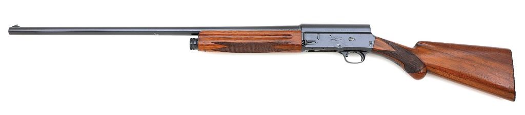 serial #104245, 16 ga, 28'' plain barrel choked marked modified but gauging full, with a bright excellent bore. The metal surfaces of this Belgian-made late 1920's made shotgun retain about 92-95% original blue with some light wear on high edges, fine oxidation staining on the receiver and scattered spots on the barrel, a few spots of wear to a silver patina on the barrel, and some scattered light handling marks. The bolt and shell carrier remain bright with scattered freckling. The checkered round knob pistolgrip walnut stock and forend are in very good plus condition with a pair of short, hairline cracks at the rear of the upper tang, some light handling marks, and the finish is showing fine craquelure along both sides of the butt; the horn buttplate shows moderate insect damage, becoming heavier along the left edge. The underside of the forend is neatly stamped ''BROWNING / 3 / SHOT'' just behind the magazine cap, the interior is serial numbered to the shotgun, and the bottom of the pistolgrip shows a small stamped that appears to be a boxed ''DG''. The factory metal markings are intact and crisp, the bolt and two of the screws being lightly numbered ''245''. The shotgun is sighted with a ramped steel bead. A nicely preserved Auto 5 produced prior to the Second World War. (14B11778-19) {C&R} (800/1200)