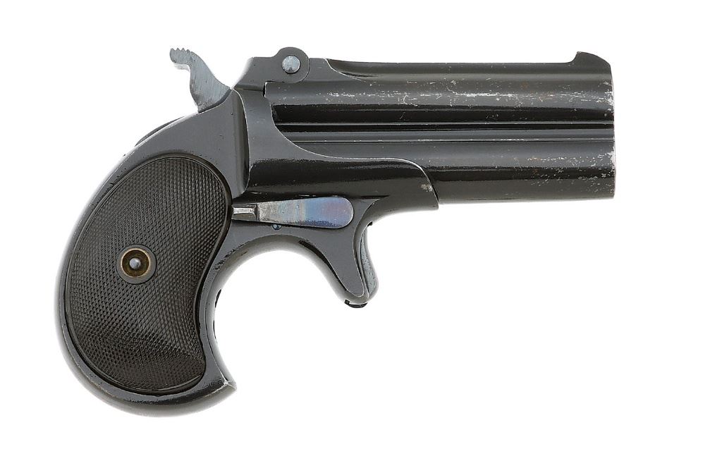 serial #L99527, 41 RF, 3'' barrels with bright excellent bores. This late-production deringe retains 97% original matte blue, showing scattered light handling wear and high-edge silvering with most of the loss focused along the flanks of the barrels showing a mix of bright gray and light oxidation staining. The distinctive grooved hammer retains nearly all of its original finish and shows fine oxidation staining in the grooves, and the locking lever shows a gradient of gunmetal into rich original blue. The checkered hard rubber grips remain excellent overall showing minimal handling wear and slightly shy fit in a few areas. The barrel rib is marked ''REMINGTON ARMS--U.M.C. CO. ILION.N.Y.'', and a crisp arrow and anchor proof are present underneath the locking lever. The gun locks up tightly and the hinge remains intact. Late-production ''Type III'' or ''Model No. 4'' examples bearing distinctive ''monoblock'' barrel markings are estimated at no more than 500 units produced, making this high-condition deringer a nice find for the Remington collector. (26A10826-168) {C&R} [Dr. W. Lloyd Hudson Jr. Collection] (800/1200)
