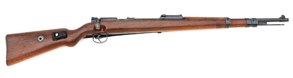 serial #241661, 22 LR, 26'' barrel with bright excellent bore. The metal surfaces retain perhaps 90% original blue with light freckling, handling marks and high edge wear. The bolt is relatively bright with oxidation throughout and the smooth stock and handguard rate near excellent with a few scattered light handling marks. The rifle is sighted with standard military-style front and rear sights. The rear sight is numbered to a different gun but is correct and the bayonet lug and cleaning rod remain present. A fine 22 LR training rifle that comes with a period correct sling and muzzle cover. (10A11630-3) {C&R} (800/1200)