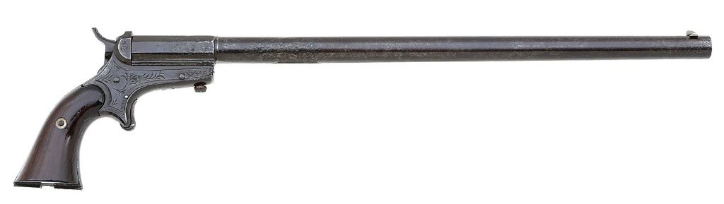 serial #2, 9mm RF (.34 cal), 13 3/4'' round barrel with octagonal breech section and an about good bore showing scattered light pitting and old oxidation with otherwise strong rifling throughout. Similar to the Model 3, the metal surfaces of this peculiar pistol have mostly toned to a deep plum-brown patina showing scattered light to moderate old pitting that is partially smoothed-over in some areas. The frame is embellished with rather crude foliate motifs and zigzag bordering and the bottom of the grip frame is grooved for attaching a period shoulder stock that is no longer present. The smooth rosewood grips remain in very fine condition right and very good plus condition left showing some light handling marks and a small hole along the base of the left panel. The front sight is a fine brass blade, the firing pin is mounted in the frame and there is a left-side barrel release button and a pull-down button on the forward underside frame for taking the barrel off quickly. The pistol is equipped with a barrel-hammer interlock safety when the hammer is at full cock and the action seems to function normally. (13A11802-6) {ANTIQUE} (600/800)