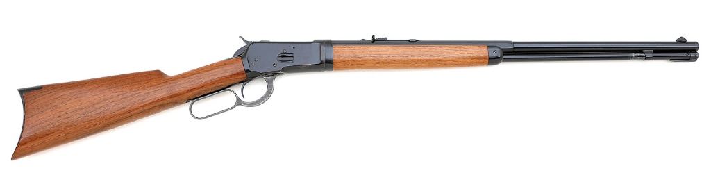 serial #300613, 25-20 W.C.F., 24'' part round part octagon barrel with an about very good bore showing scattered light pitting but evident rifling throughout. The metal surfaces of this 1905-made rifle retain about 95% reapplied blue with light wear on high edges and contact points, a few spots of finish loss on the right side of the frame, and some speckled fine oxidation and handling marks. The lever has toned largely to a gray case-hardened patina with areas toning lightly to brown, and a small remnant of case color at the root. The smooth straight grip walnut stock and forend are contemporary replacement and are in excellent condition. The two-line Winchester barrel address and other factory markings are intact and crisp, and some of the screws show some light slot wear. The rifle is sighted with a Lyman ''Hunting'' front sight and a flattop sporting-style rear sight, and the rifle takes down correctly. (14A11669-6) {C&R} (700/900)
