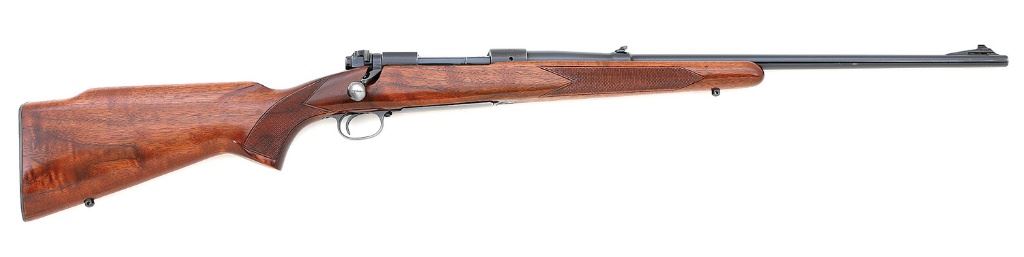 serial #251382, 270 Win., 24'' barrel with bright excellent bore. The metal surfaces of this 1953-manufactured rifle retain perhaps 90% original blue with light handling marks and specks of scattered fine oxidation staining. The bottom metal retains about 80% blue with high edge and carry wear, with specks of fine oxidation staining. The checkered steel buttplate is mostly a blue-gray with silvering on the points. The bolt body remains mostly bright and the handle is a mix of plum and gray patinas. The checkered Monte Carlo pistolgrip stock rates about very good with light handling marks and has a repaired 1 1/4'' crack on the right side of the forend that is easily overlooked. The original sights remain intact. (10A11791-3) {C&R} (700/900)