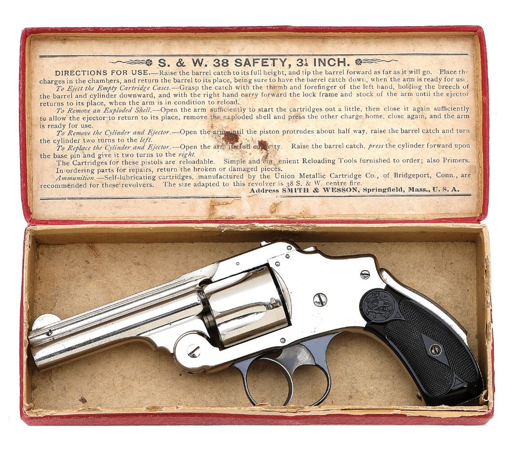 serial #13018, 38 S&W, 3 1/4" barrel with a bright about very good bore showing scattered pinprick pitting throughout with strong rifling. The metal surfaces retain 98% original nickel finish, showing some scattered light handling wear throughout with a few minor flecks of oxidation visible in the areas of loss under direct light, with the trigger toning to a smoky gunmetal patina and showing handsome case-hardened colors and the triggerguard retaining generous original blue. The checkered hard rubber grips rate excellent, remaining a deep and handsome black and showing little if any handling wear. Timing and lockup appear sound, the ejector remains robust with strong spring and snap, and the grip safety functions as it should. Included is the original hinged maroon cardboard box, correctly end-labeled to the revolver, which remains in excellent overall condition showing minimal edge or corner wear. A lovely Safety Hammerless package. (26A10826-662) {ANTIQUE} [Dr. W. Lloyd Hudson Jr. Collection] (700/900)