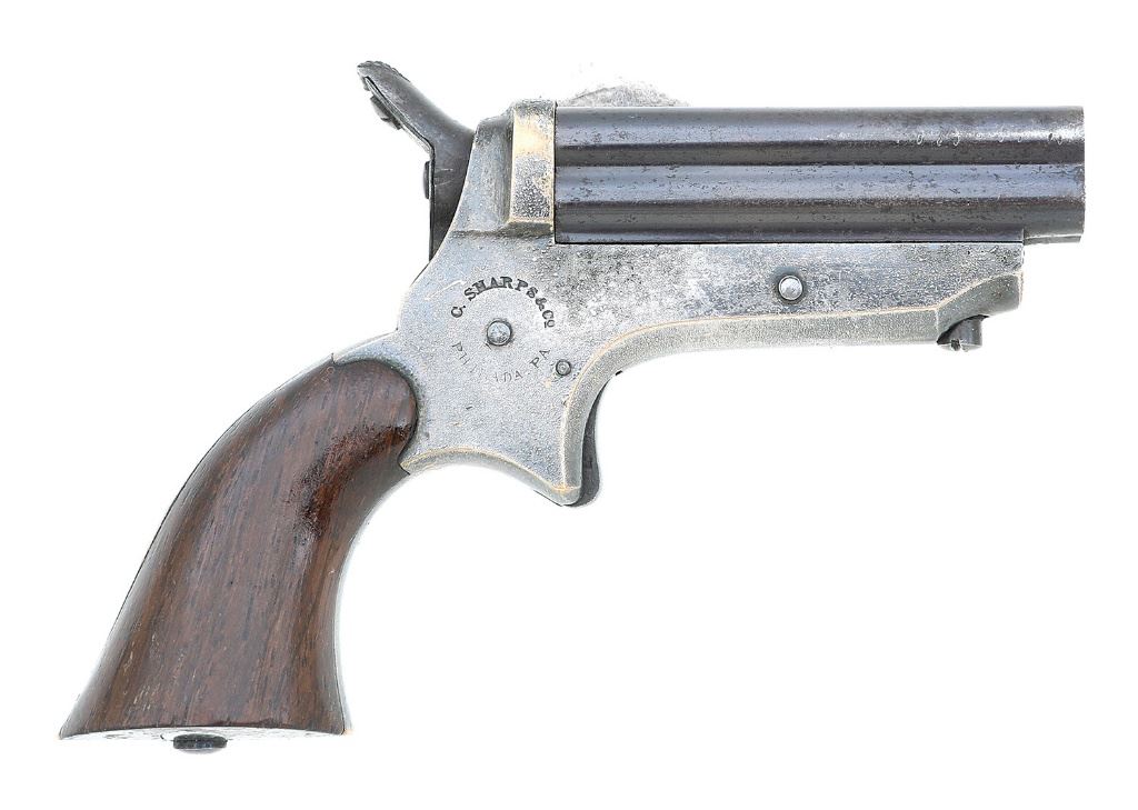 serial #12152, 22 RF, 2 1/2'' four-barrel cluster with oxidized bores showing some scattered bright areas and generally strong rifling. The barrels retain about 85% original bright blue showing some light oxidation speckling and flaking to gray-brown patina. The frame retains about 90-92% original silver finish that shows some wear along the high edges to ocher brass and scattered fine bubbling, the silver taking on a lovely tarnish overall. The hammer and trigger are a dark gray patina, the hammer back spring retaining good fire blue, and the markings remain mostly strong except for the patent date on the left side of the frame which was lightly struck. The smooth rosewood panels retain strong original varnish throughout, the left panel rating very fine showing a thin sliver missing at the heel and the right panel rating excellent. The barrels lock-up well and the action seems to function well mechanically with properly rotating nose. A fine Sharps pepperbox. (13A11777-25) {ANTIQUE} (700/900)