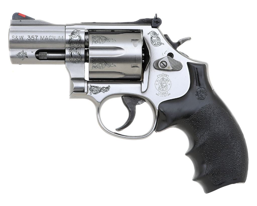 serial #DAX4510, 357 Magnum, 2 1/2" full lug barrel with an excellent bore. This lovely gun has about 25% coverage of loose scroll laser engraving with wedges on the barrel, frame and cylinder. There is no documentation to indicate factory work but it is consistent with factory laser engraving. The stainless steel surfaces rate about excellent with a turn ring on the cylinder and minor handling wear. The smooth combat trigger and service hammer retain full case-hardened colors with light operational wear. The pebble grain Hogue Bantam Boot grips with S&W logo rate excellent. The revolver features a red ramp front sight and white outline micro adjustable rear sight. The revolver includes a factory hard case numbered to the gun, fired case, (1) internal lock key, Hogue Bantam grip tool, cable lock with a pair of keys, manual and paperwork. This would make a great home defense or carry gun with a little added panache. (11739-168) {MODERN} (700/900)
