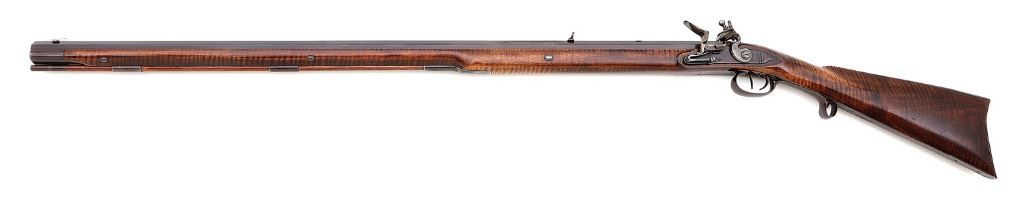 .55 cal, 37 1/2'' octagon barrel with a bright excellent bore. The metal surfaces of this nicely made rifle retain about 94% original plum-brown finish showing some scattered high edge wear, a few oxidation speckles along the barrel and areas thinning to gray. The right barrel shank shows ''L.DAY'' maker stamp and ''2.89'' date. The barrel is secured by three wedges and the lock features faceted waterproof pan, step at rear and the frizzen and frizzen spring show pale tempered straw color. The attractive curly maple stock rates very fine retaining most of its original finish with just some sparsely scattered light dings and handling marks. The wood exhibits some wonderful tiger stripe grain figure throughout and the stock features a scant squared-off right-side cheekpiece and is fitted with spartan iron hardware including heavy nosecap, dual ramrod thimbles, tailpipe, triggerguard with curlicue at rear, crescent buttplate with toe plate and pointed teardrop lock screw escutcheon. There are two rear sight dovetails, one blanked and the other with a square notch semi-buckhorn sight and the front is a generous German silver blade. The original ramrod is present and the lock with double set triggers seems to function normally. (13A11723-1) {ANTIQUE} (700/900)