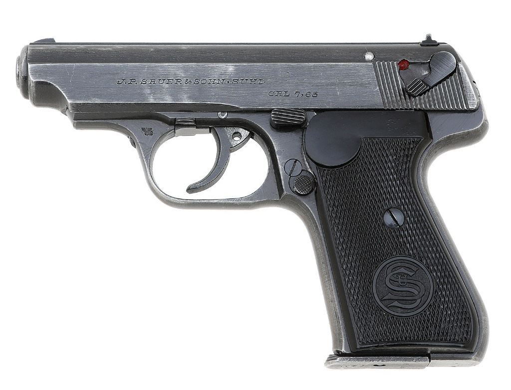 serial #353915, 32 ACP, 3 1/2'' barrel with a bright near excellent bore showing a few small oxidation speckles and strong rifling throughout. The metal surfaces of this second variation pistol retain about 80-85% original thinning dull blue showing some scattered holster wear and gripstraps toning to smooth gunmetal gray patina. All markings remain crisp and clear showing ''(Eagle) / N'' commercial proofs and ''(Eagle) C'' police stamp on the left side of the triggerguard. The original black checkered Bakelite grips remain in very fine to near excellent condition showing some scattered light dings and handling marks, mostly nearer the bases. The serialized parts are matching and one original magazine with steel ''SuS'' floorplate is included. The lever does not cock the hammer but the de-cocking system is functional and the action otherwise seems to function normally. (13A11728-896) {C&R} (700/900)