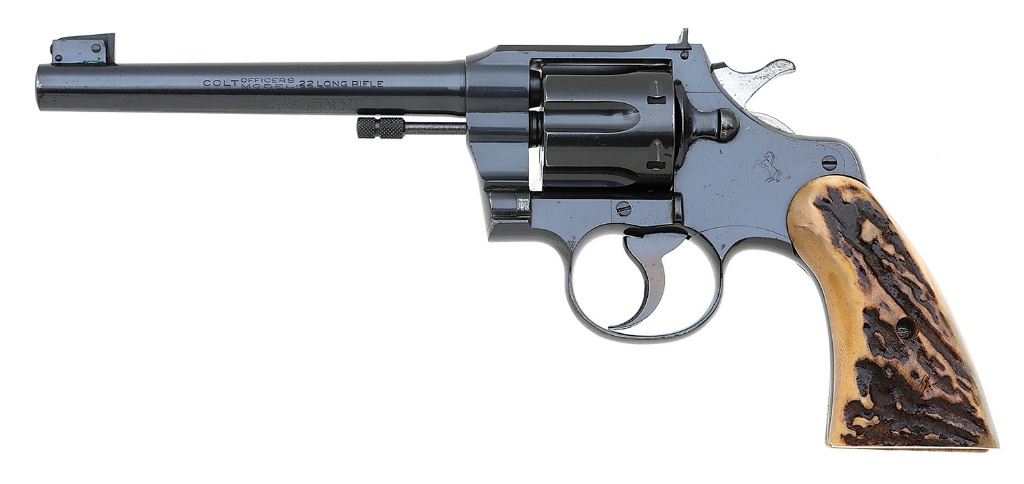 serial #23012, 22 LR, 6'' barrel with an excellent bore. This lovely revolver shows light use and remains in excellent condition. The metal surfaces retain about 98% to perhaps 99% original blue showing light edge wear and handling marks. The service trigger and hammer retain strong blue while the sides of the hammer remain bright with minor staining. The unmarked replacement stag service style grips rate excellent, they have aged to a pleasing yellow hue with strong bark on each panel. This gun is sighted with an elevation adjustable Patridge front sight and windage adjustable rear sight. An excellent early war (1941) revolver. (8A11728-924) {C&R} (700/900)