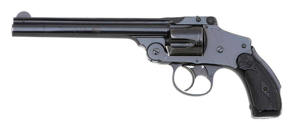 serial #133453, 38 S&W, scarce 6'' barrel with a bright good bore showing pitting throughout with strong rifling. This Fourth Model retains perhaps 90% original blue, showing scattered dings and handling marks, high-edge silvering, and an area of old cleaned pitting on the left side of the barrel and the crest of the barrel rib having toned to gunmetal and the cylinder and grip strap toning largely to brown. The trigger and rear sight latch have toned to a smoky gunmetal and the triggerguard and cylinder both retain generous original finish in the protected areas. The checkered hard rubber grips rate near-excellent, with the left panel showing little wear to speak of and the right with scattered handling wear and a small chip missing near the heel. Timing and lockup appear sound, the ejector functions robustly with strong spring and snap, and the grip safety appears to function as it should. (26A10826-612) {C&R} [Dr. W. Lloyd Hudson Jr. Collection] (700/900)