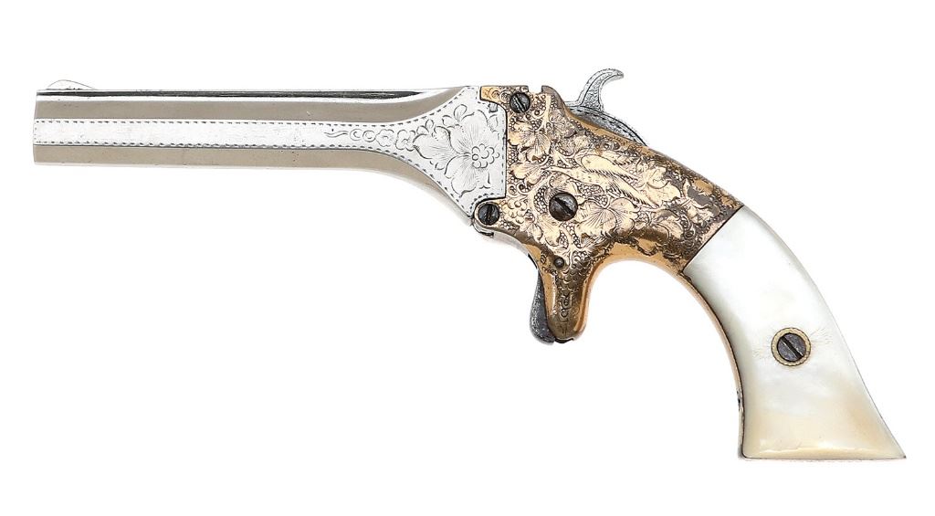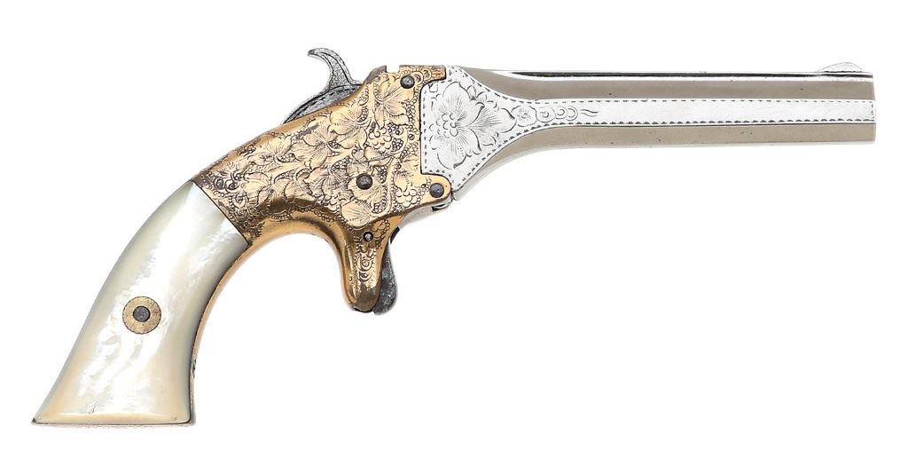 22 RF, 3 1/2" barrel with a bright very good bore showing scattered light pitting with strong rifling throughout. This deringer shows handsome floral scroll throughout the flanks, punch-dot shading along the frame with the left-side depicting a perched egret ready to take flight, and more light foliate scroll and geometric bordering. The brass frame remains largely bright and fine, showing light handling marks and scattered light tarnish throughout, and the patent markings on the butt remain mostly crisp and legible having softened slightly. The barrel assembly retains 99% reapplied nickel finish, showing remnants of old pinprick pitting under the finish, with the barrel address marking and all engraving still remaining strong. The smooth mother-of-pearl grips remain excellent, showing minimal handling wear with fine striations forming out from the escutcheons. The arm locks up tightly and appears to function mechanically, though it is devoid of its rear sight, leading to the barrel locking latch being quite loose and often allowing the barrel to swing free upon cocking the hammer. Regardless, this remains a fine and charming example of these relatively scarce New Haven-made deringers. (26B11666-38) {ANTIQUE} [Casey Collection] (700/900)