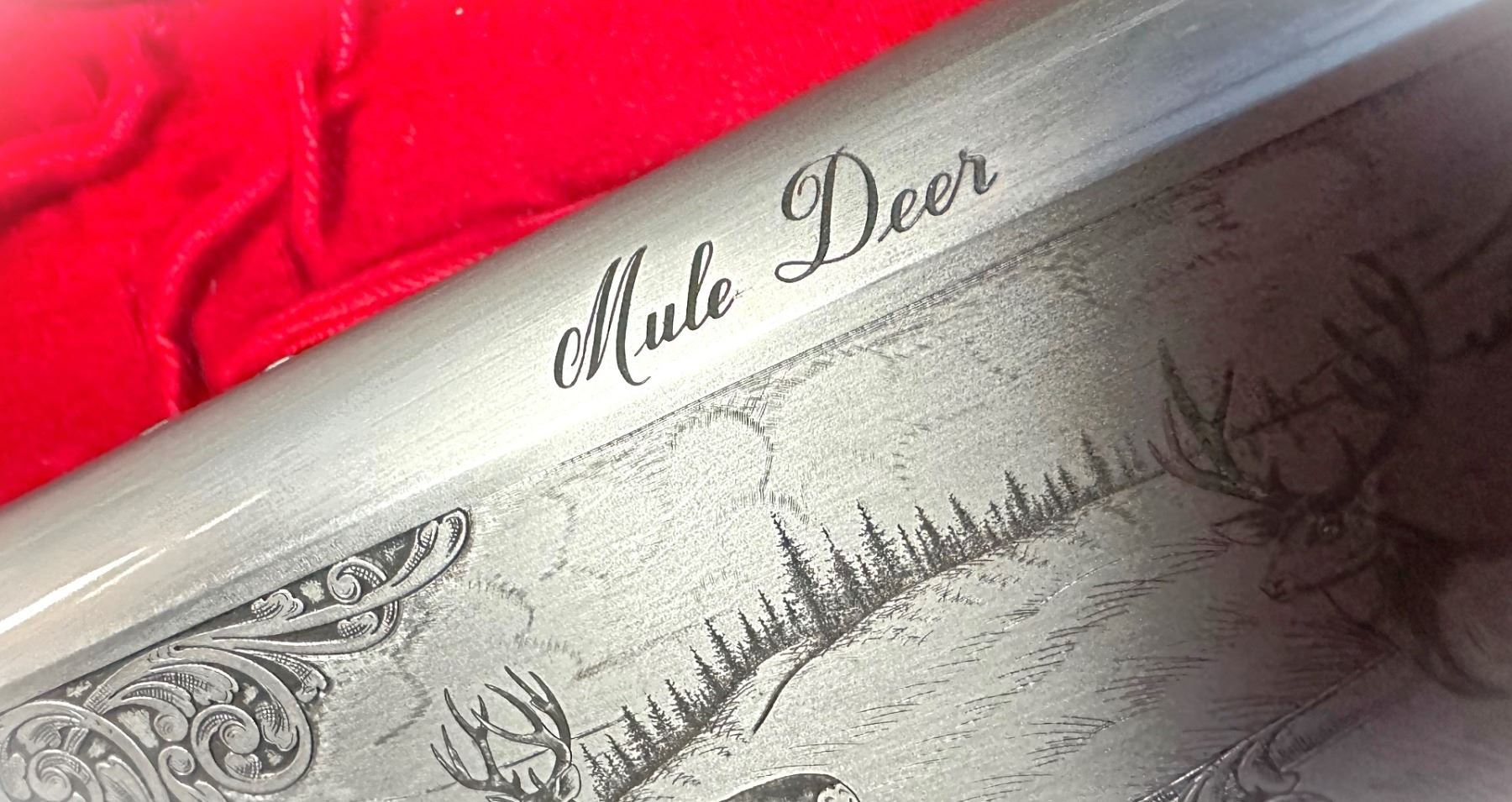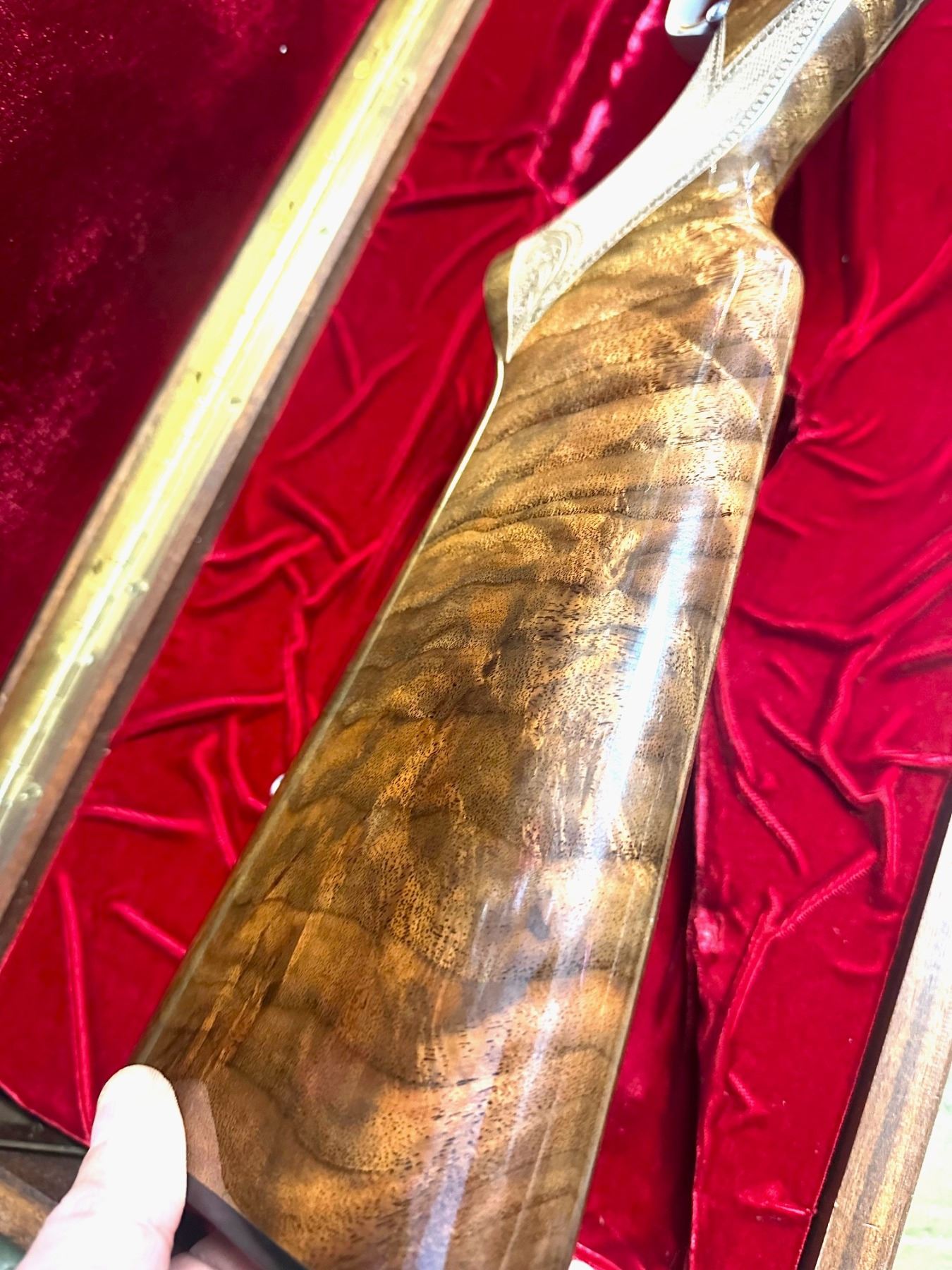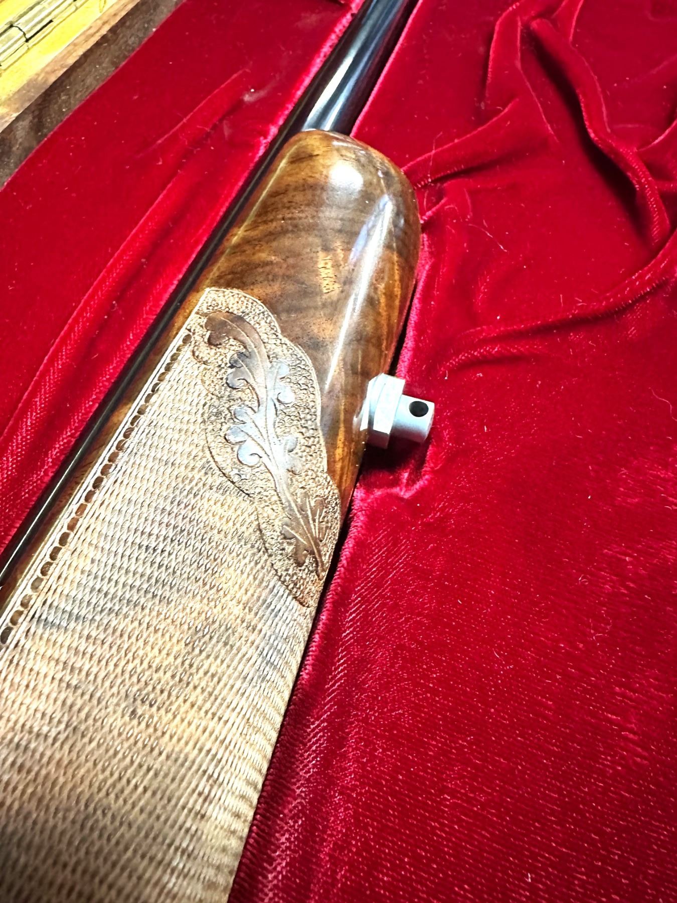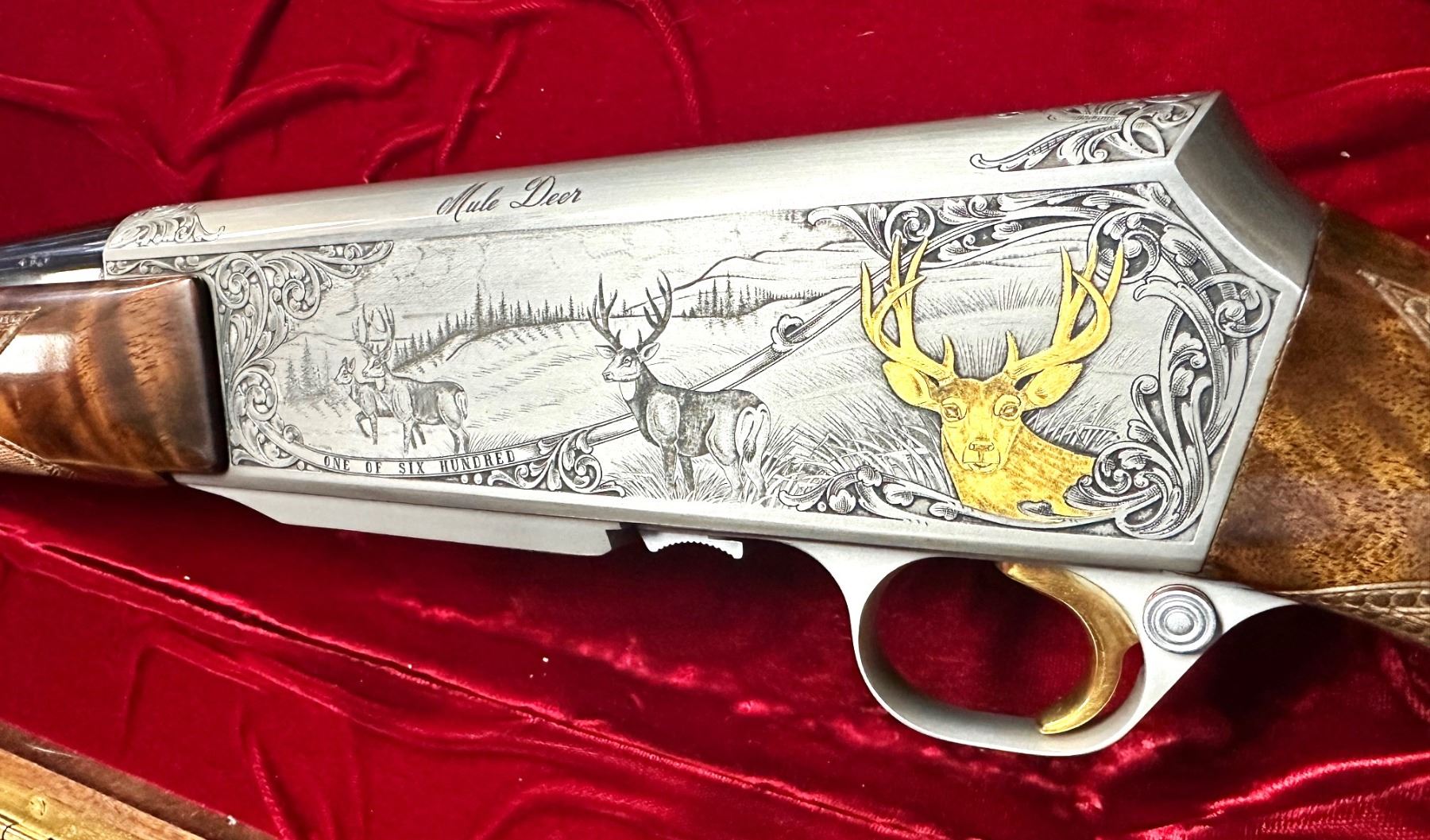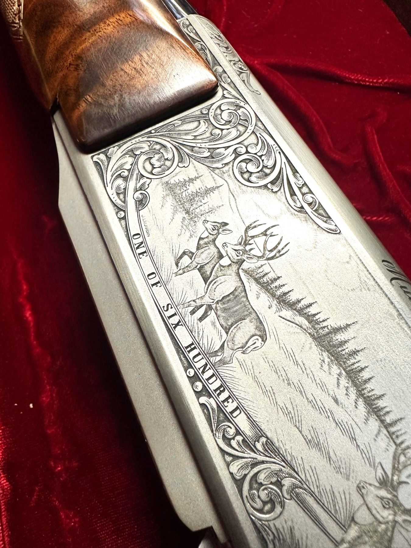 There were only 600 of these rifles manufactured in a limited edition run. This rifle is number 379 of 600. The left side of the receiver is signed "J.DUJARDIN" and has floral scroll designs around the outside edge with detailed engraving of three mule deer in a field and there is a gold inlaid bust of a mule deer at the rear. The right side of the receiver is signed "R.COENEN" and has three whitetail deer in a field with a ribbon at the bottom engraved "379 OF SIX HUNDRED" and a gold inlaid bust of a whitetail deer at the rear. The top of the receiver, floor plate and trigger guard also have floral scroll designs. Mounted on a beautifully figured multi-point checkered walnut forearm with carved floral scroll at the front of the checkering and carved circles around the other edges of the checkering. The pistol grip stock also has carved circles around the outside edges of the checkering with carved floral scroll at the bottom. There is a plastic Browning buttplate. With a red velvet lined walnut case.