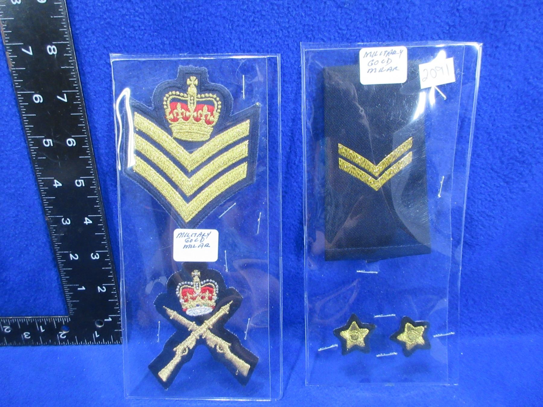 2 Military Gold Mylar Chevrons and 3 Badges