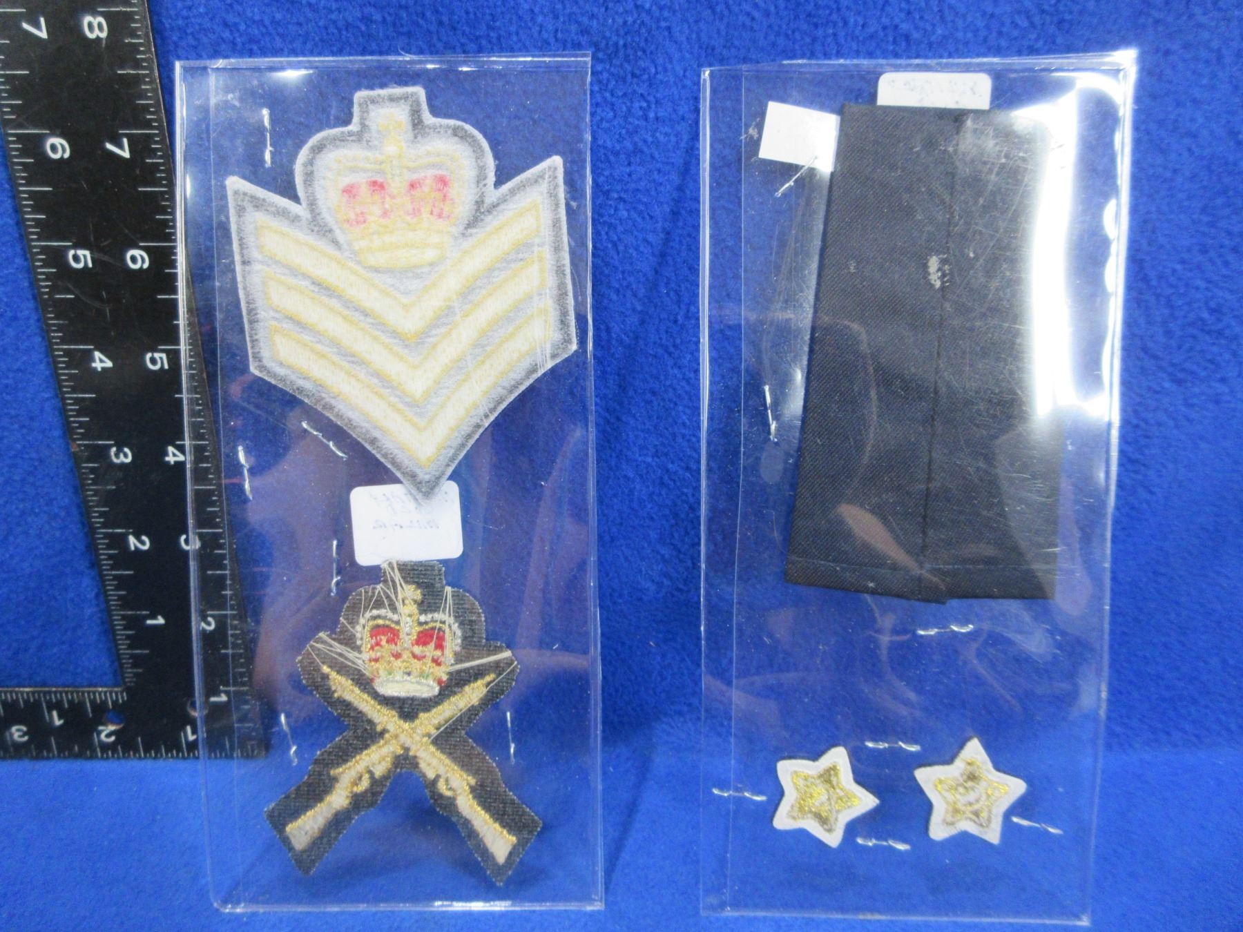 Lot 2091 2 Military Gold Mylar Chevrons and 3 Badges