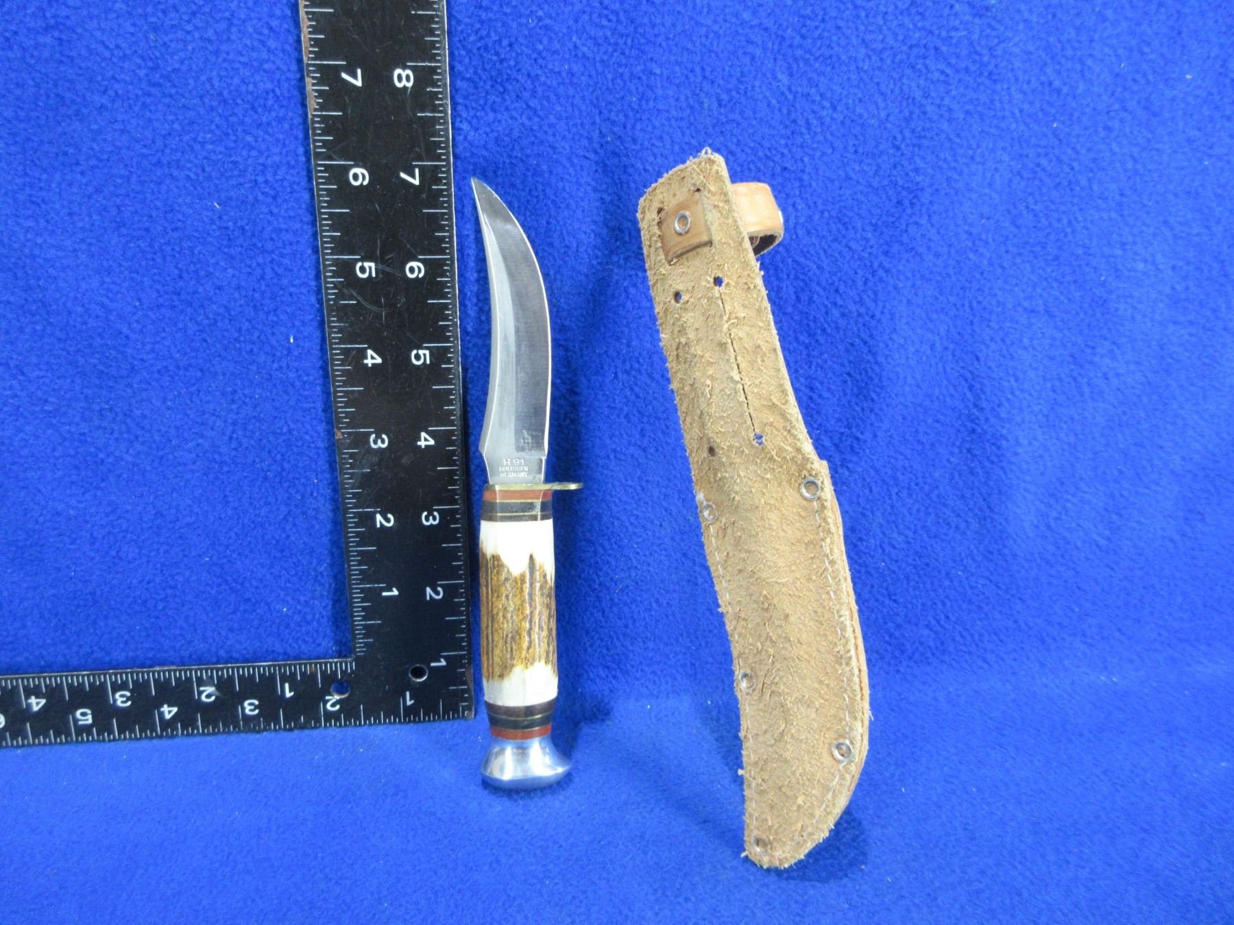 Buffalo Skinner H91 Fixed Blade Knife with Leather Sheath - Solingen Germany - 3 1/2" Blade, Stag Handle