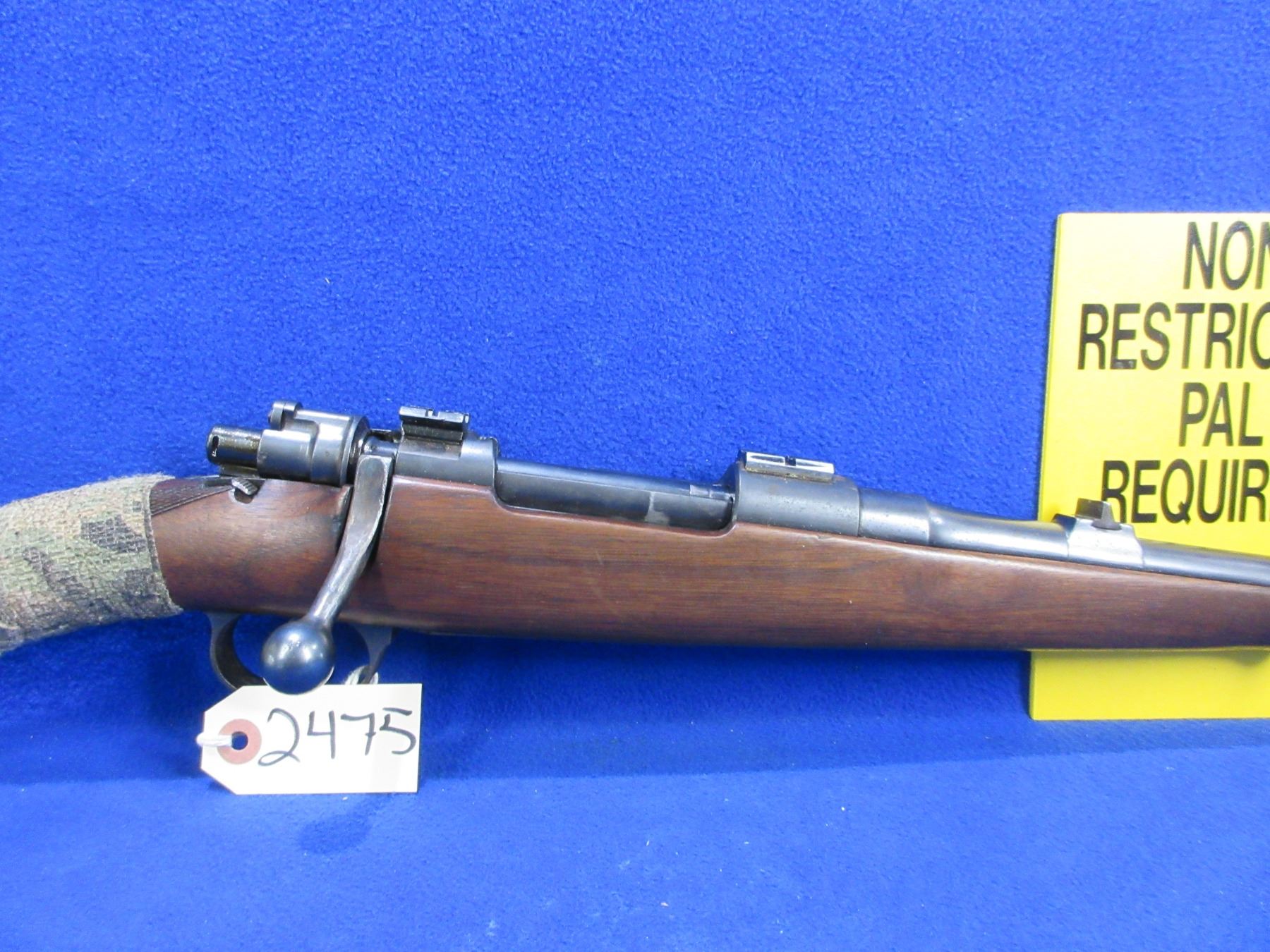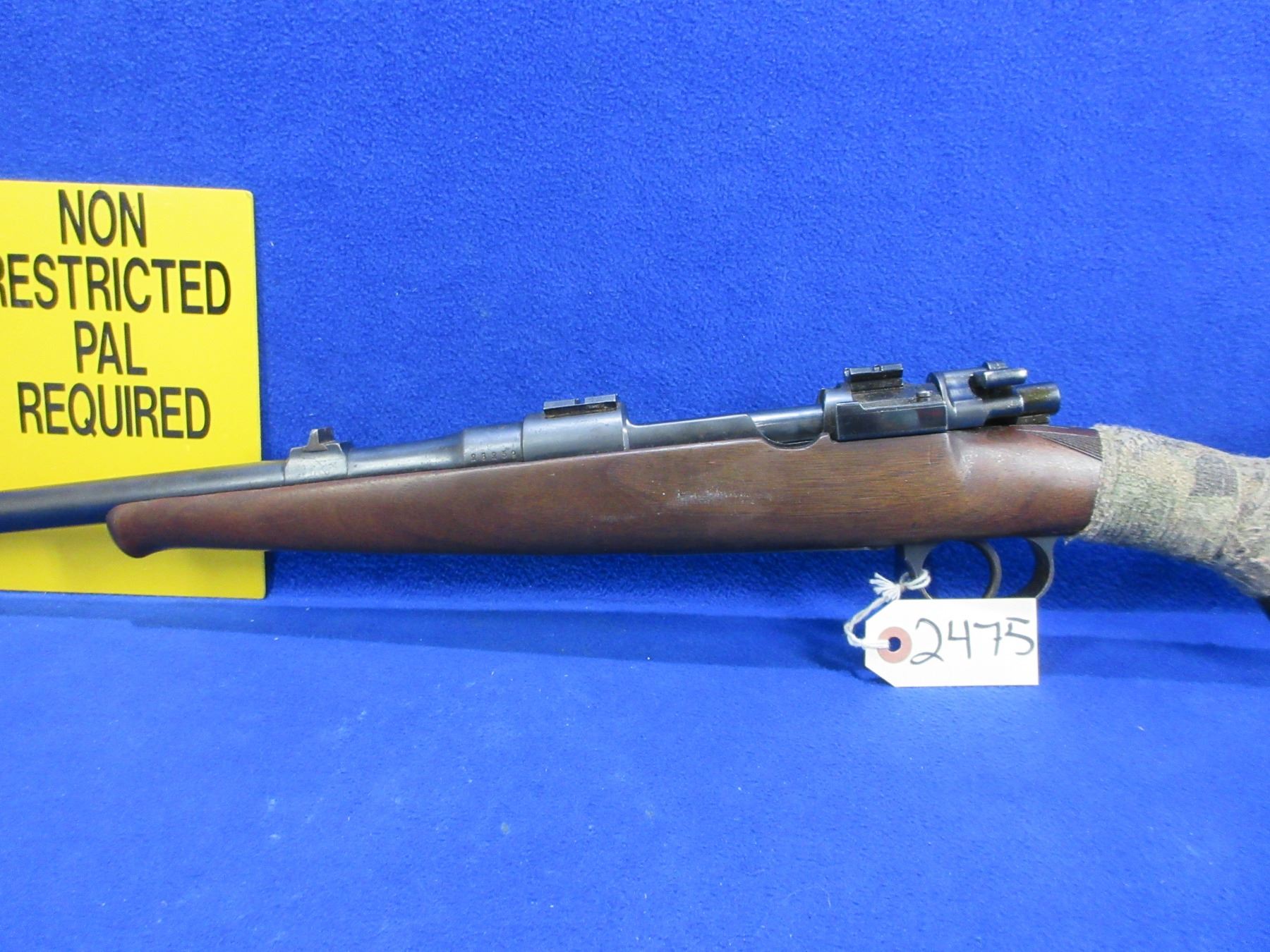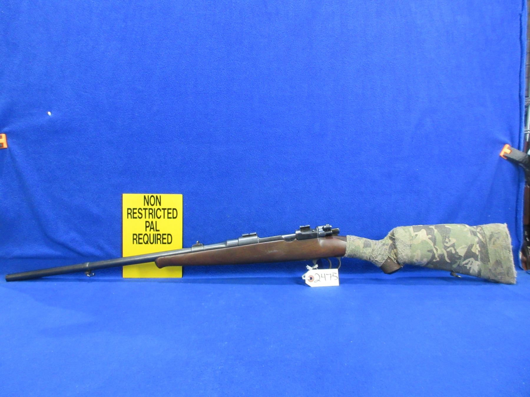 Non-Restricted - Husqvarna Model M98 in 93x57- This bolt action rifle with floorplate magazine appears to be in good to very good working order. Barrel is 21" and has been shortened but not finished correctly, rifling is good to very good, bluing is good, has rear sights and Weaver style bases, stock appears good but is wrapped in camo tape, comes with swivels. Ser #28259